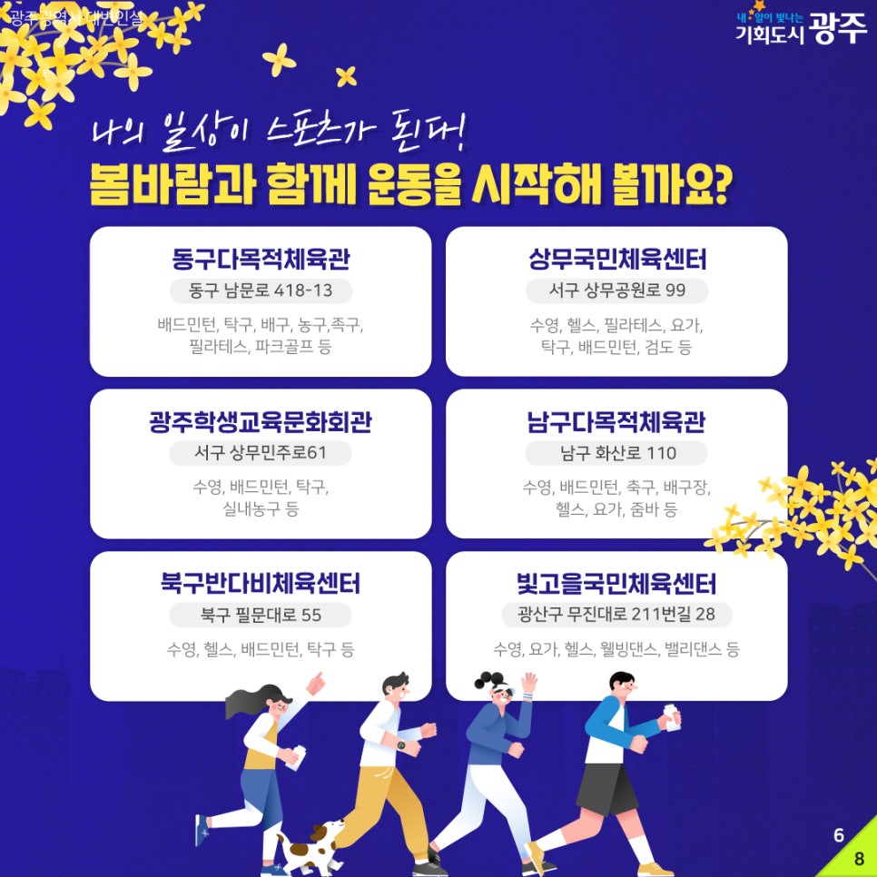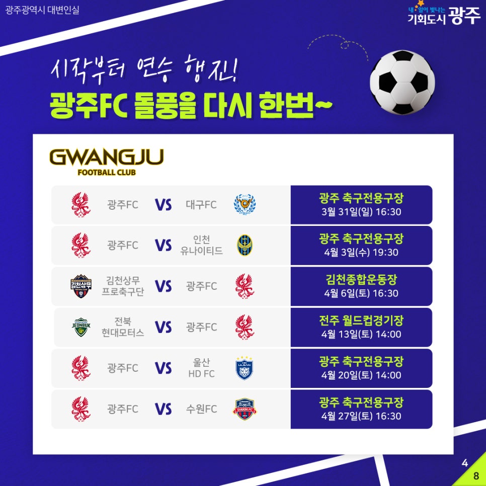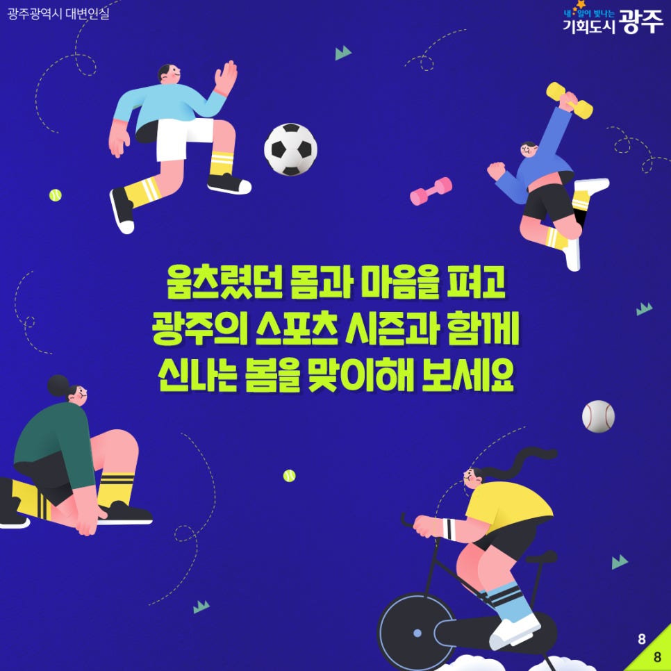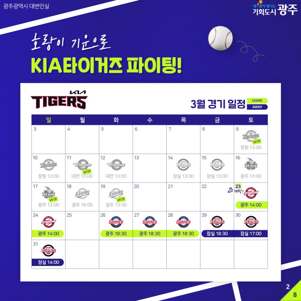 ⚾광주 스포츠 시즌 즐겨보기⚽ 등록일 : 2024-03-26 10:26 작성자 : 운영자 조회수 : 639 첨부파일 1.jpg 다운로드 광주에 스포츠 봄바람이 불고 있습니다!KIA타이거즈와 광주FC를 열심히 응원하고봄을 맞아 우리동네 체육관과 광장에서오.운.완을 해보는건 어떨까요?3・4월 관람하기 좋은 스포츠 일정과무료 운동 스팟까지 다 알려드릴게요~움츠렸던 몸과 마음을 펴고광주의 스포츠 시즌과 함께신나는 봄을 맞이해 보세요~[출처]광주광역시 목록