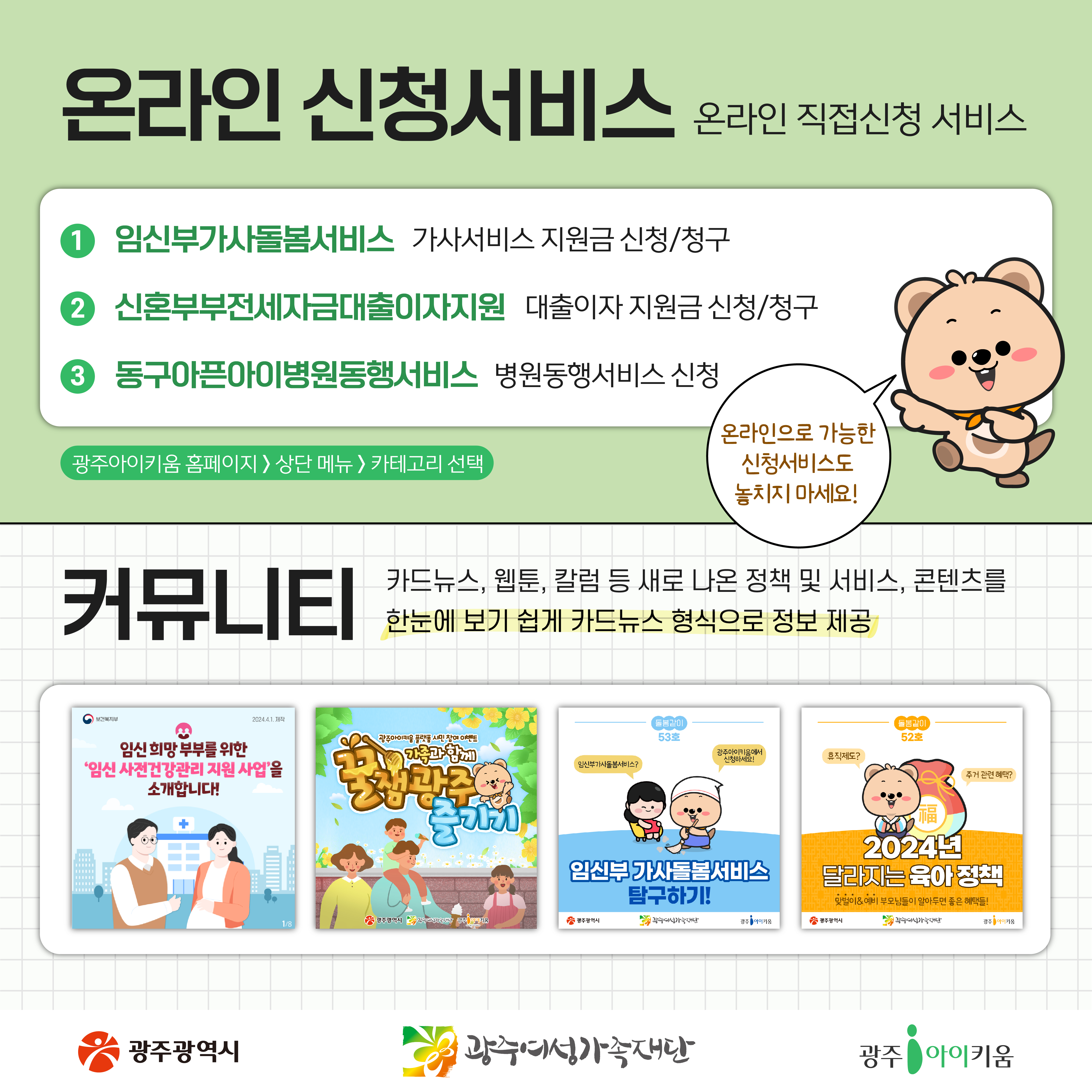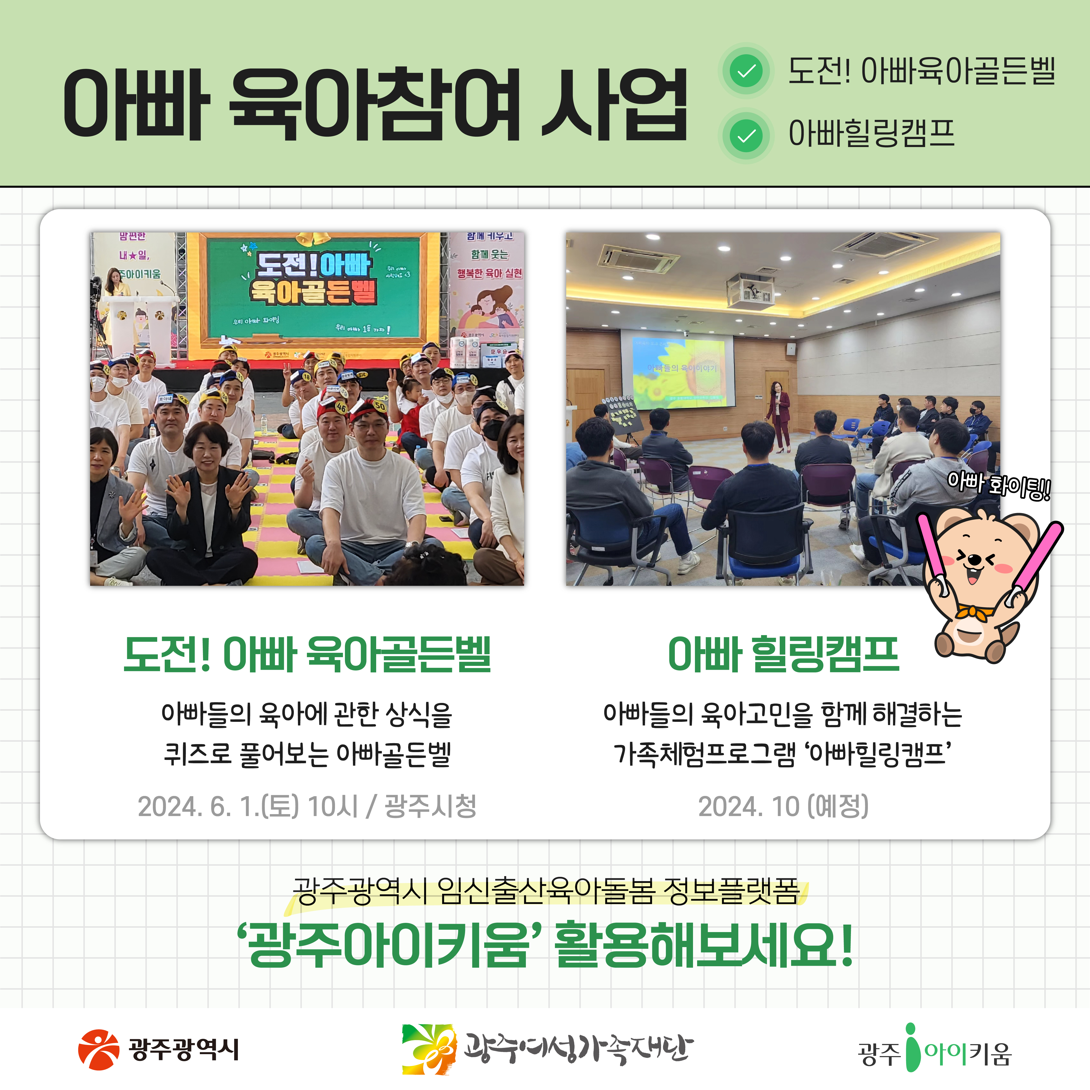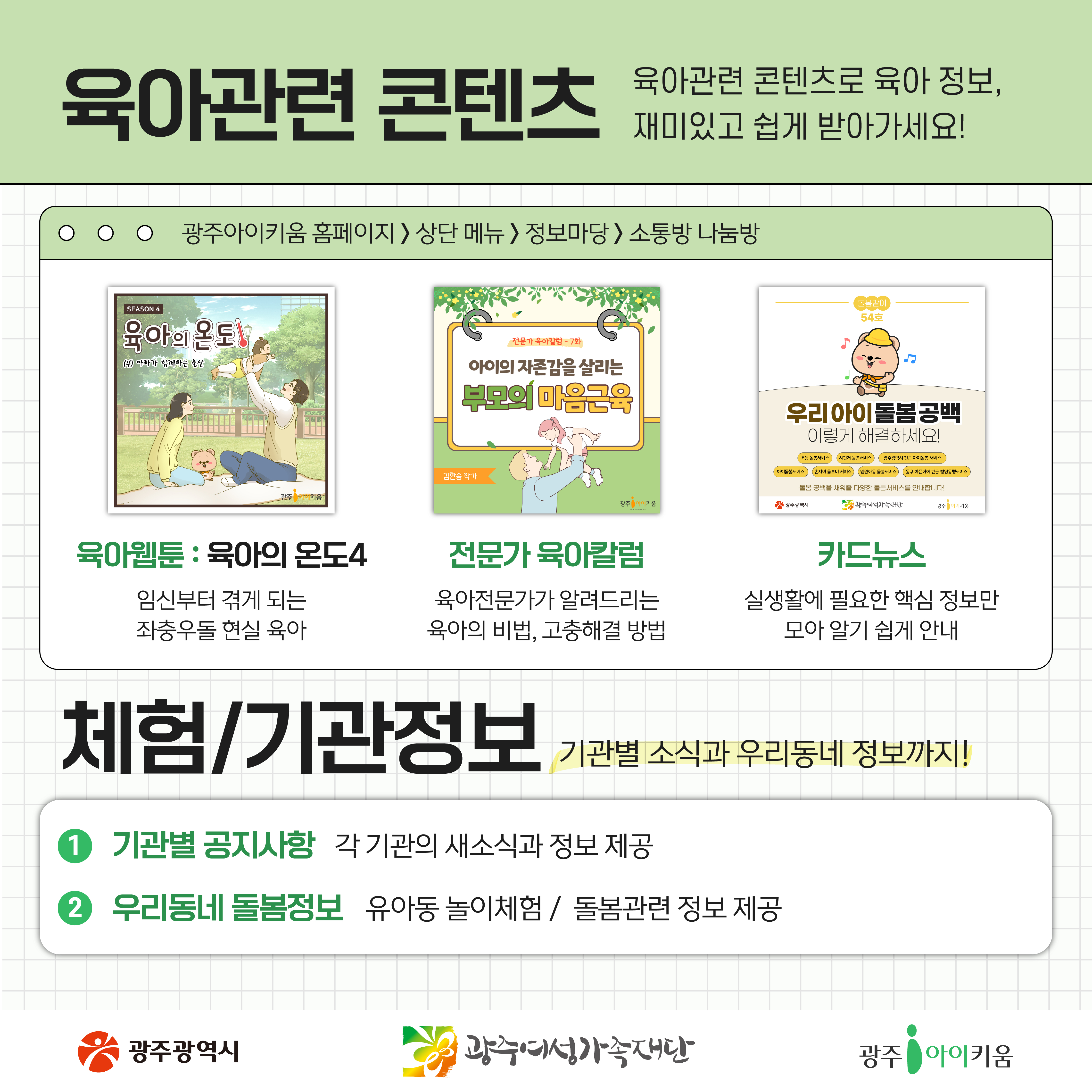 돌봄같이 55호- 광주아이키움 활용법 대공개 등록일 : 2024-05-07 09:33 작성자 : 운영자 조회수 : 668 첨부파일 KakaoTalk_20240502_110927063.jpg 다운로드 목록