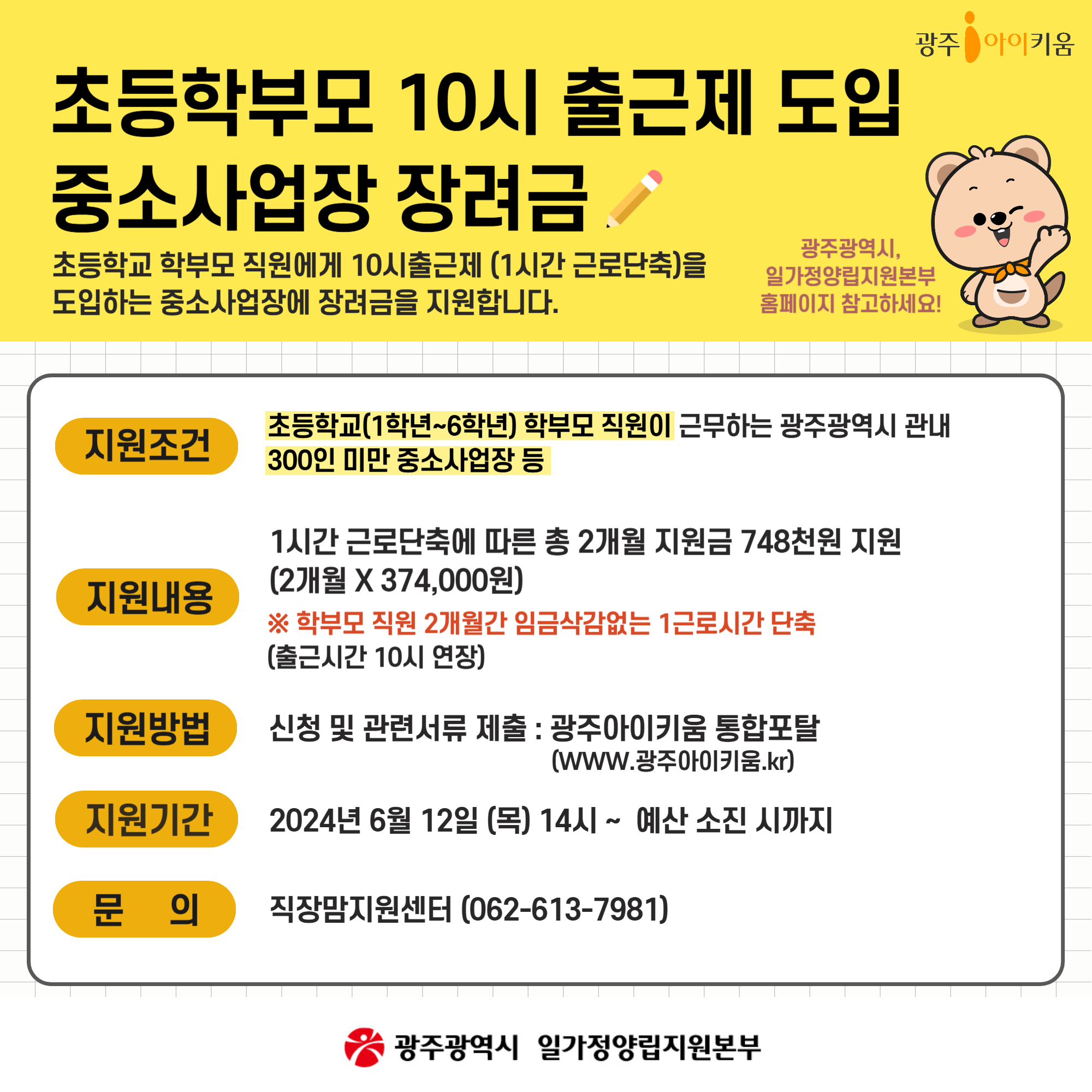 초등학부모 10시 출근제 도입 중소사업장 장려금 지원 등록일 : 2024-06-07 13:23 작성자 : 운영자 조회수 : 749 첨부파일 KakaoTalk_20240607_132446853.png 다운로드 목록