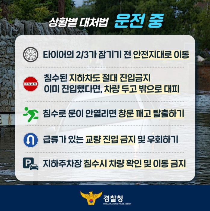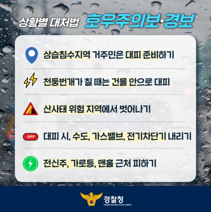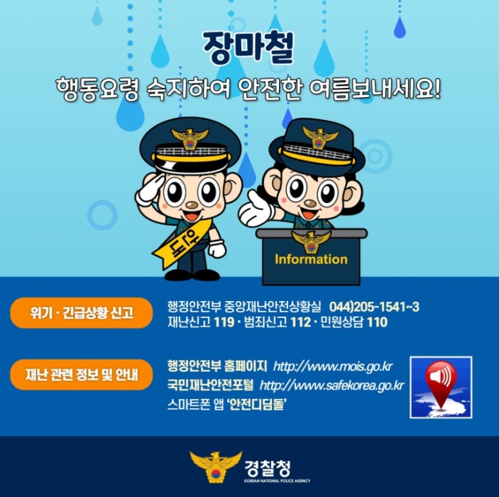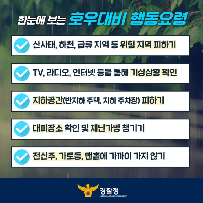 💦장맛비가 쏟아진다! 집중호우 시 행동요령 알아보세요💦 등록일 : 2024-07-03 13:42 작성자 : 운영자 조회수 : 428 첨부파일 KakaoTalk_20240703_131919493.png 다운로드 <출처> 경찰청 목록