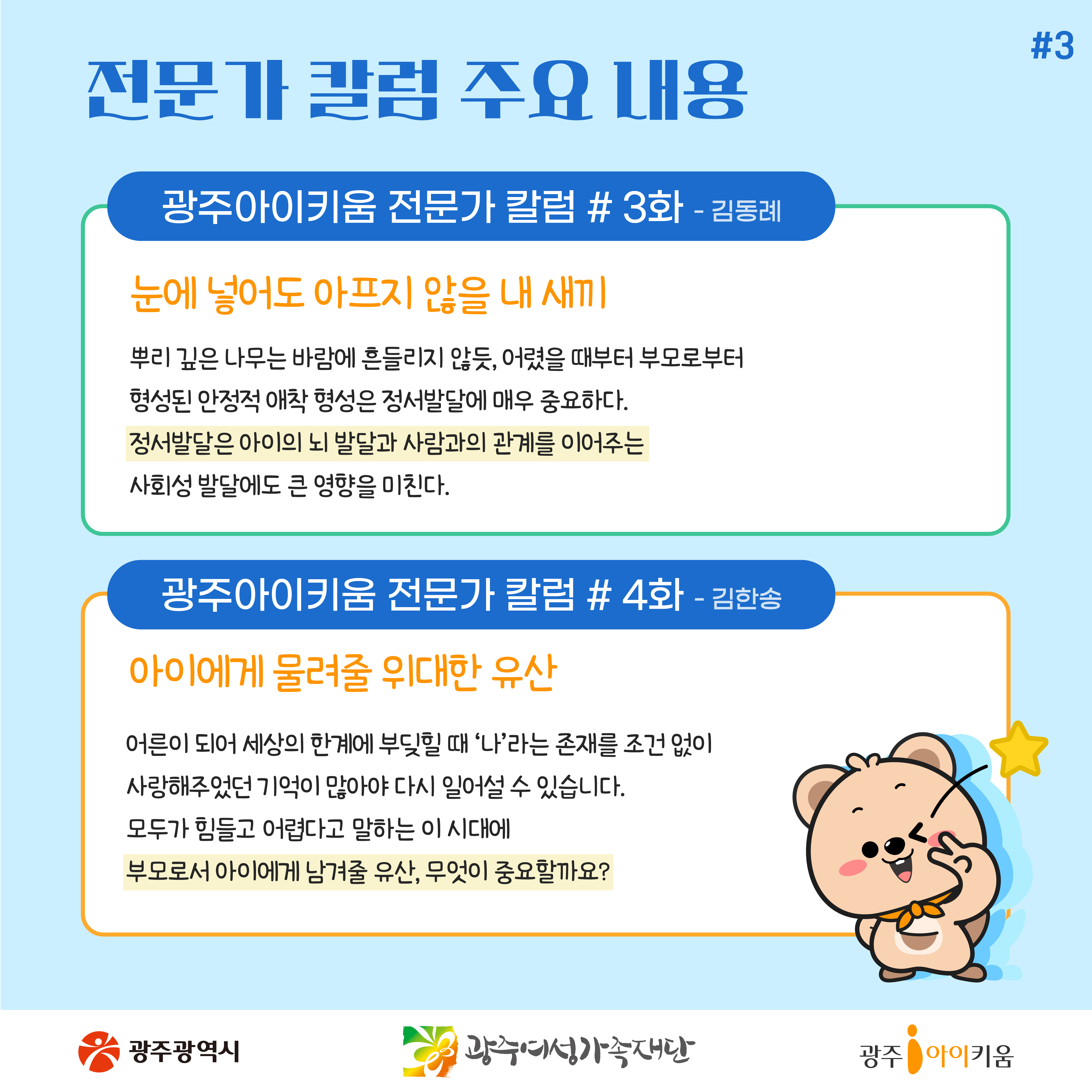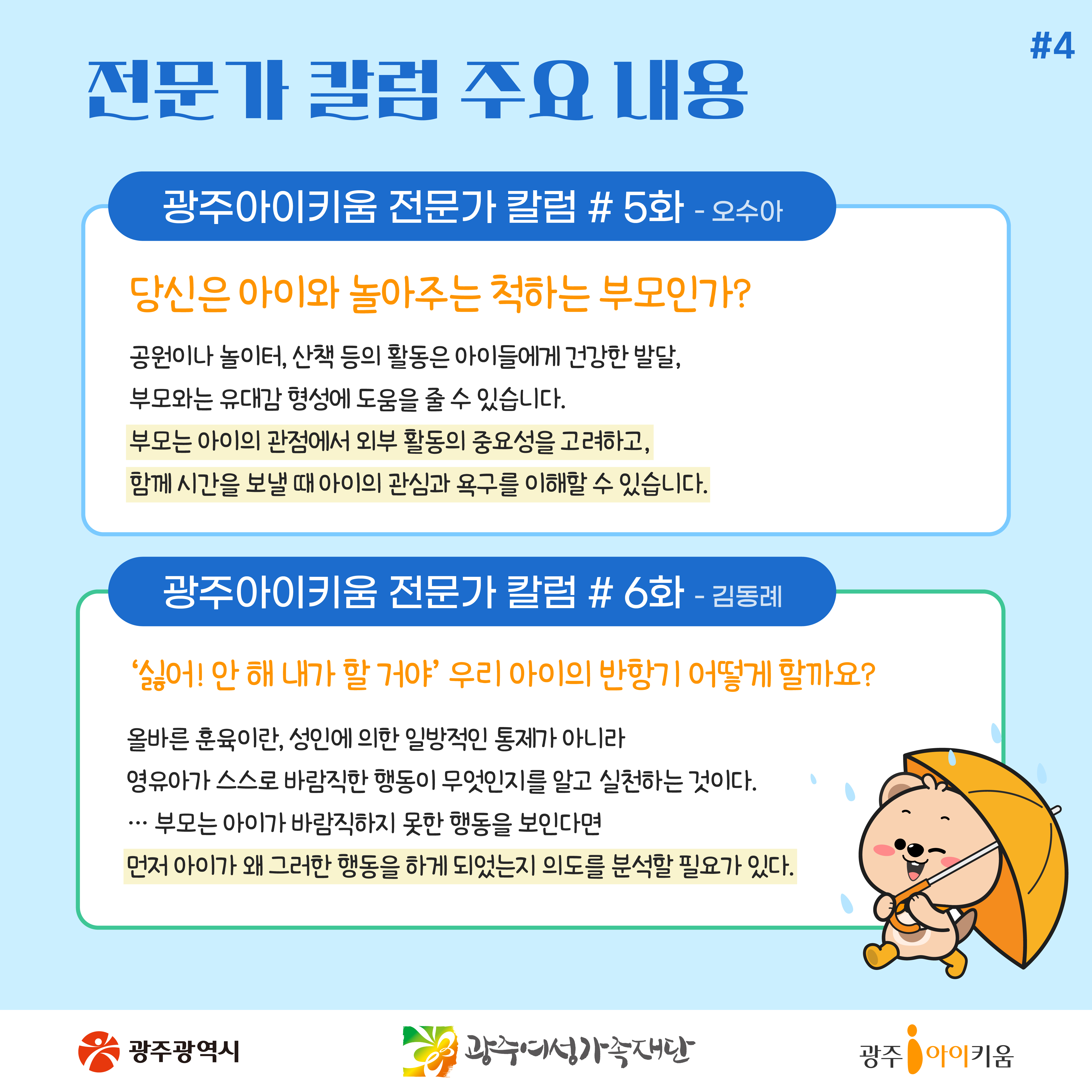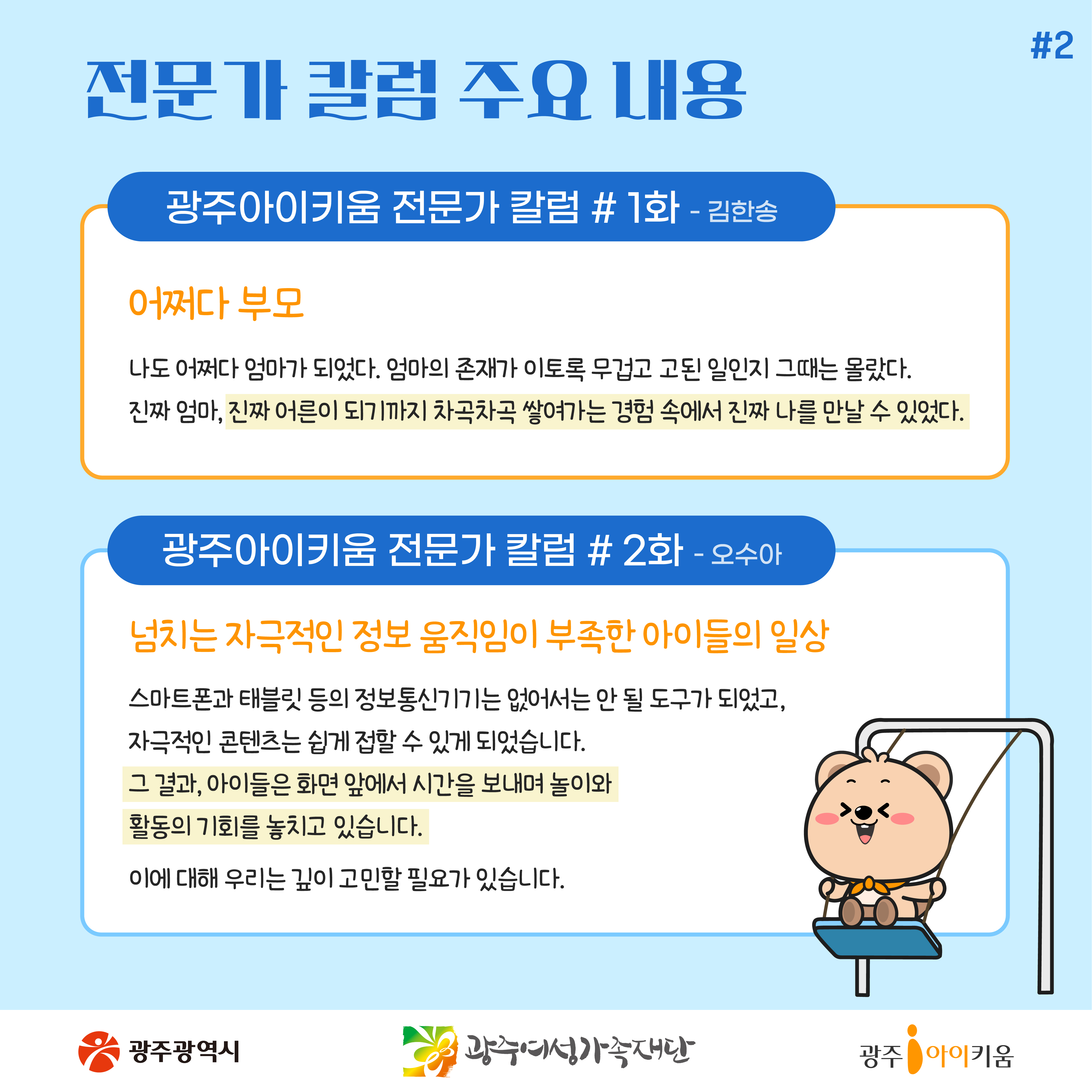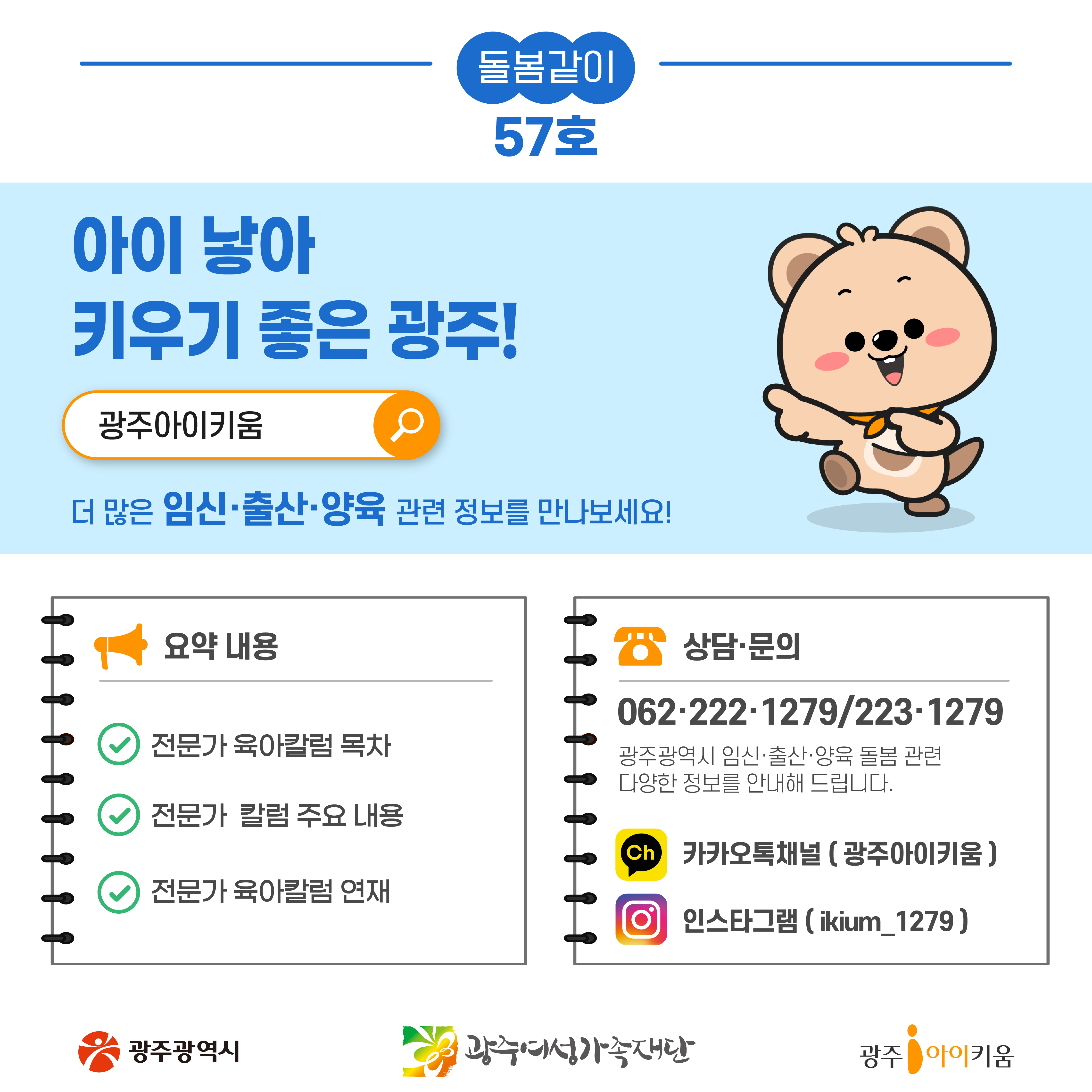 돌봄같이 57호 - 한눈에 보는 전문가 육아칼럼! 등록일 : 2024-08-08 11:22 작성자 : 운영자 조회수 : 456 첨부파일 KakaoTalk_20240801_130321148.jpg 다운로드 목록