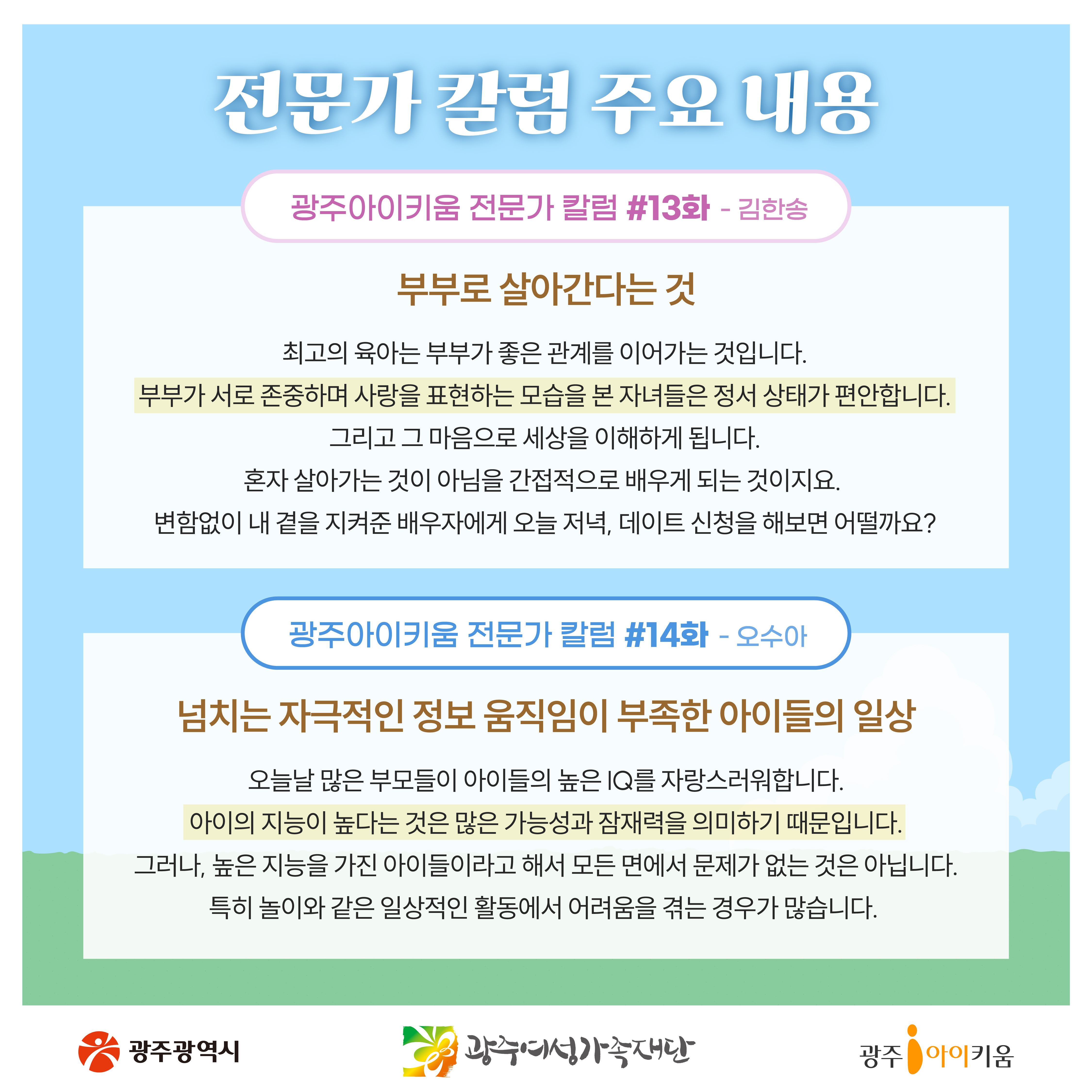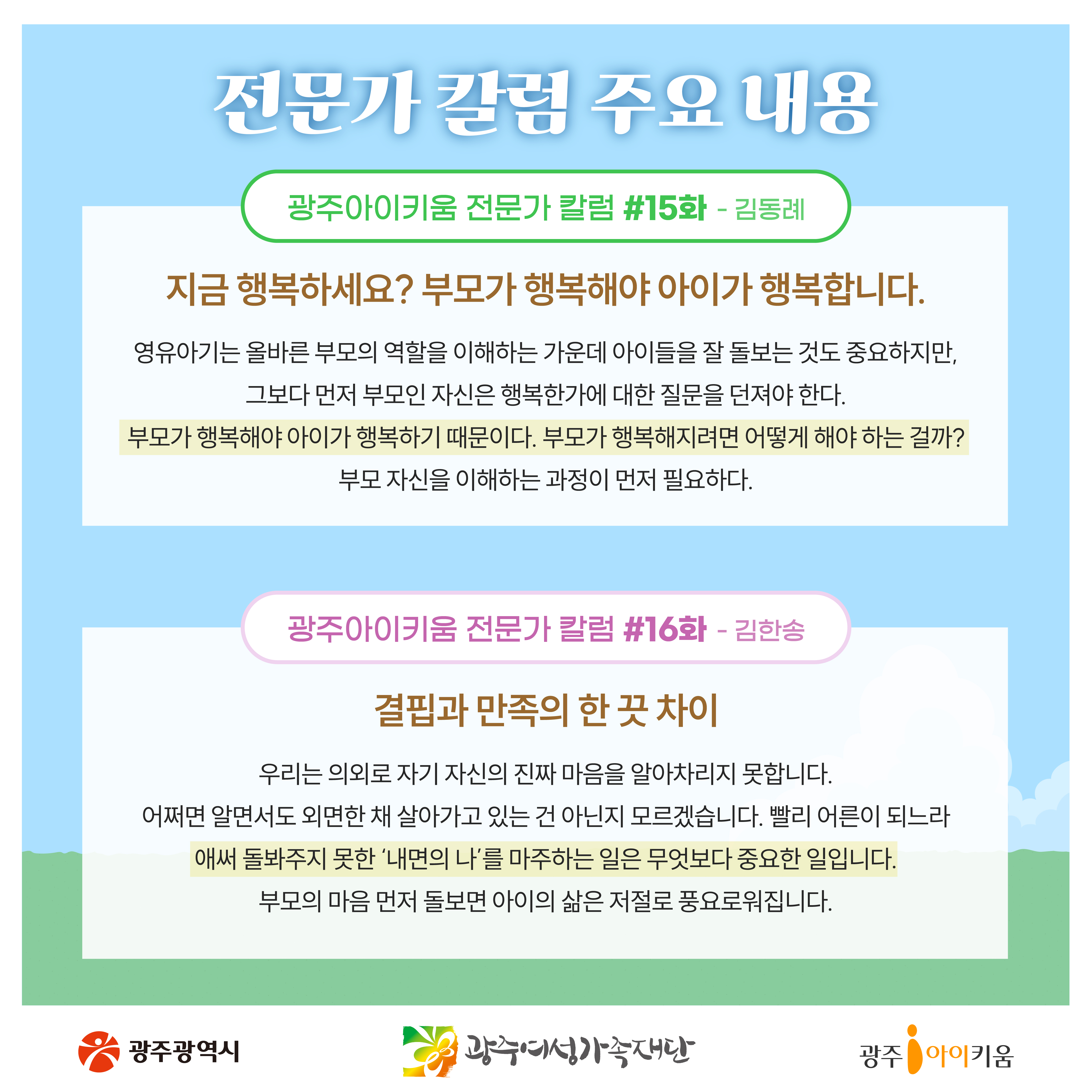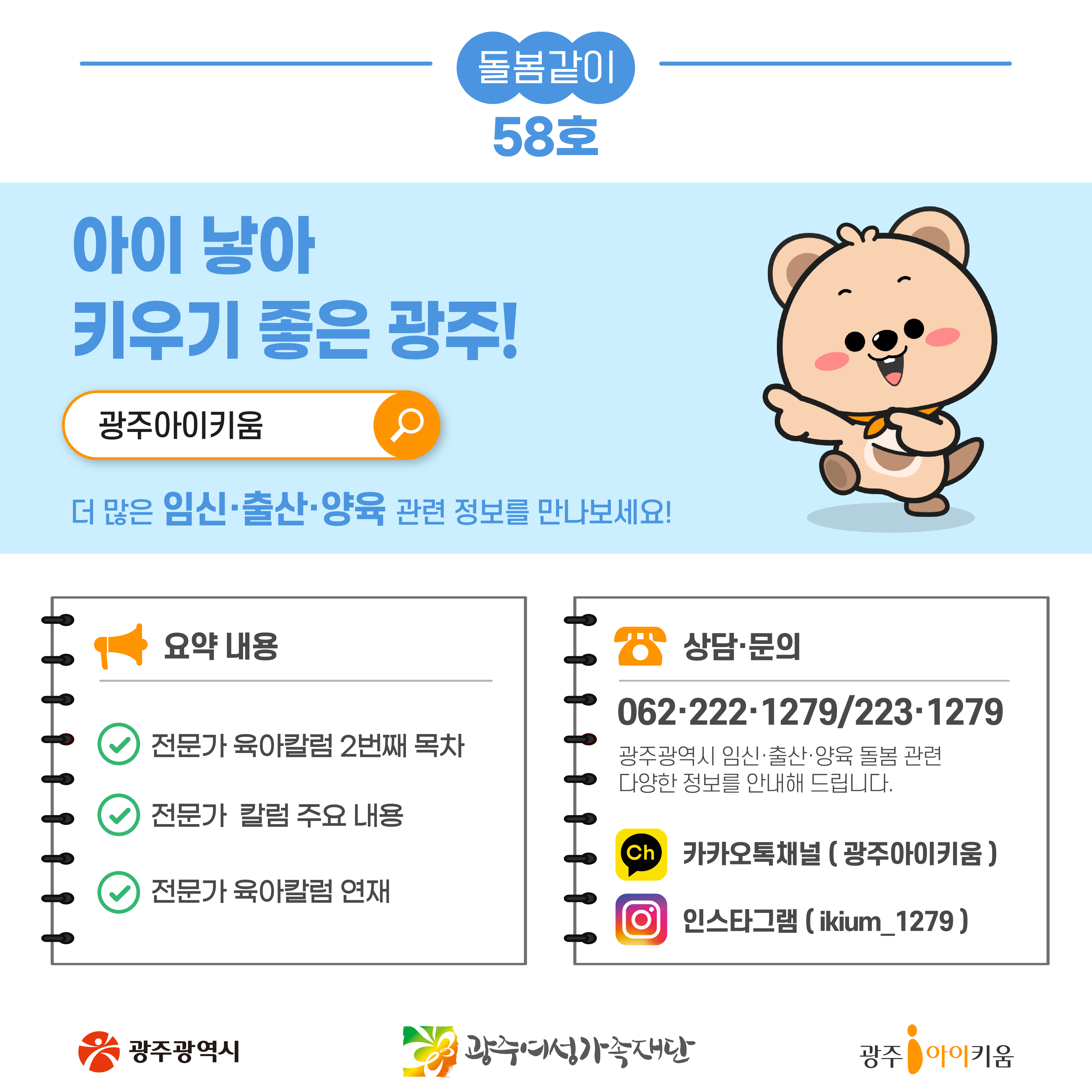 [돌봄같이 58호] 한눈에 보는 전문가 육아칼럼 소개 2번째 등록일 : 2024-08-27 08:53 작성자 : 운영자 조회수 : 394 첨부파일 KakaoTalk_20240822_130210171.jpg 다운로드 목록