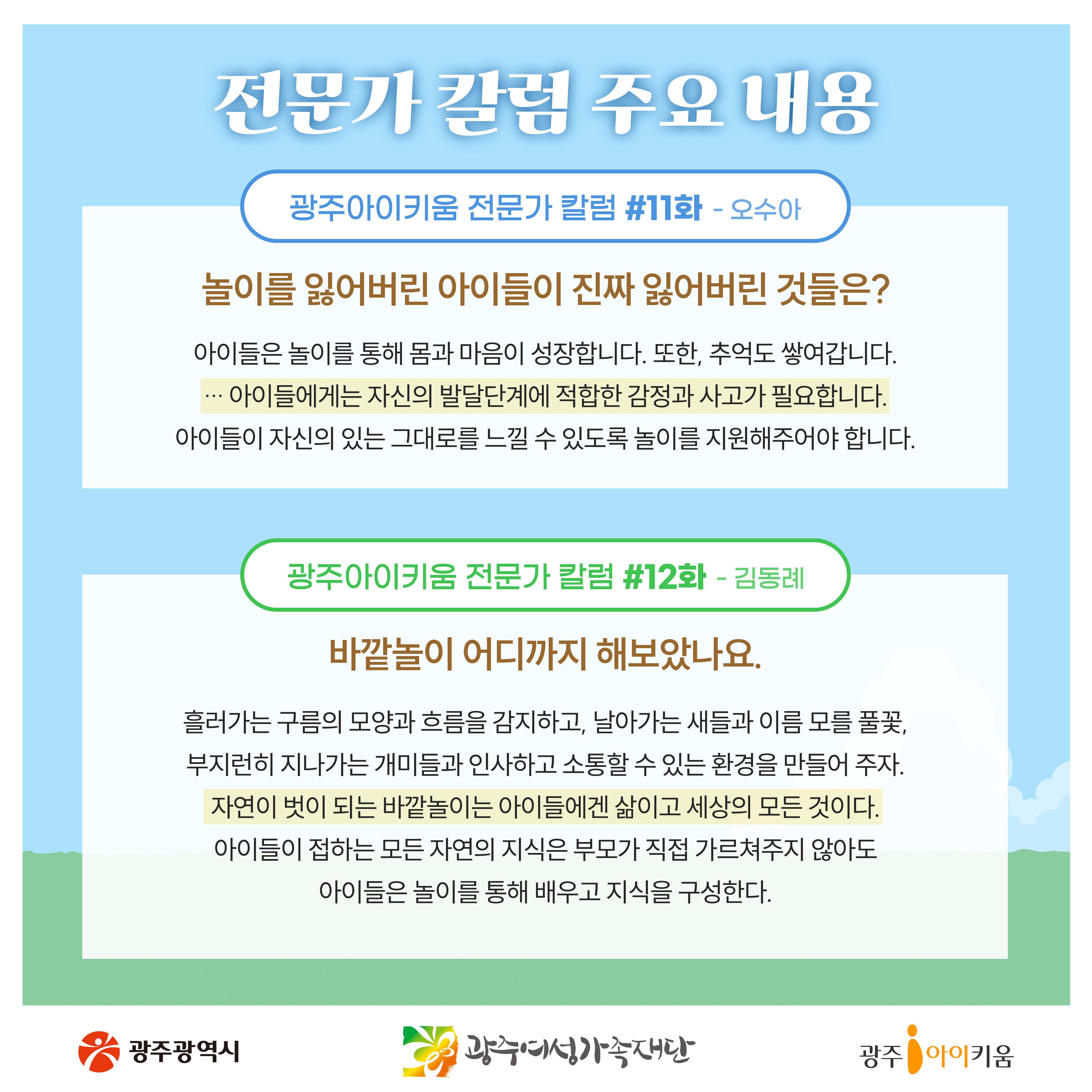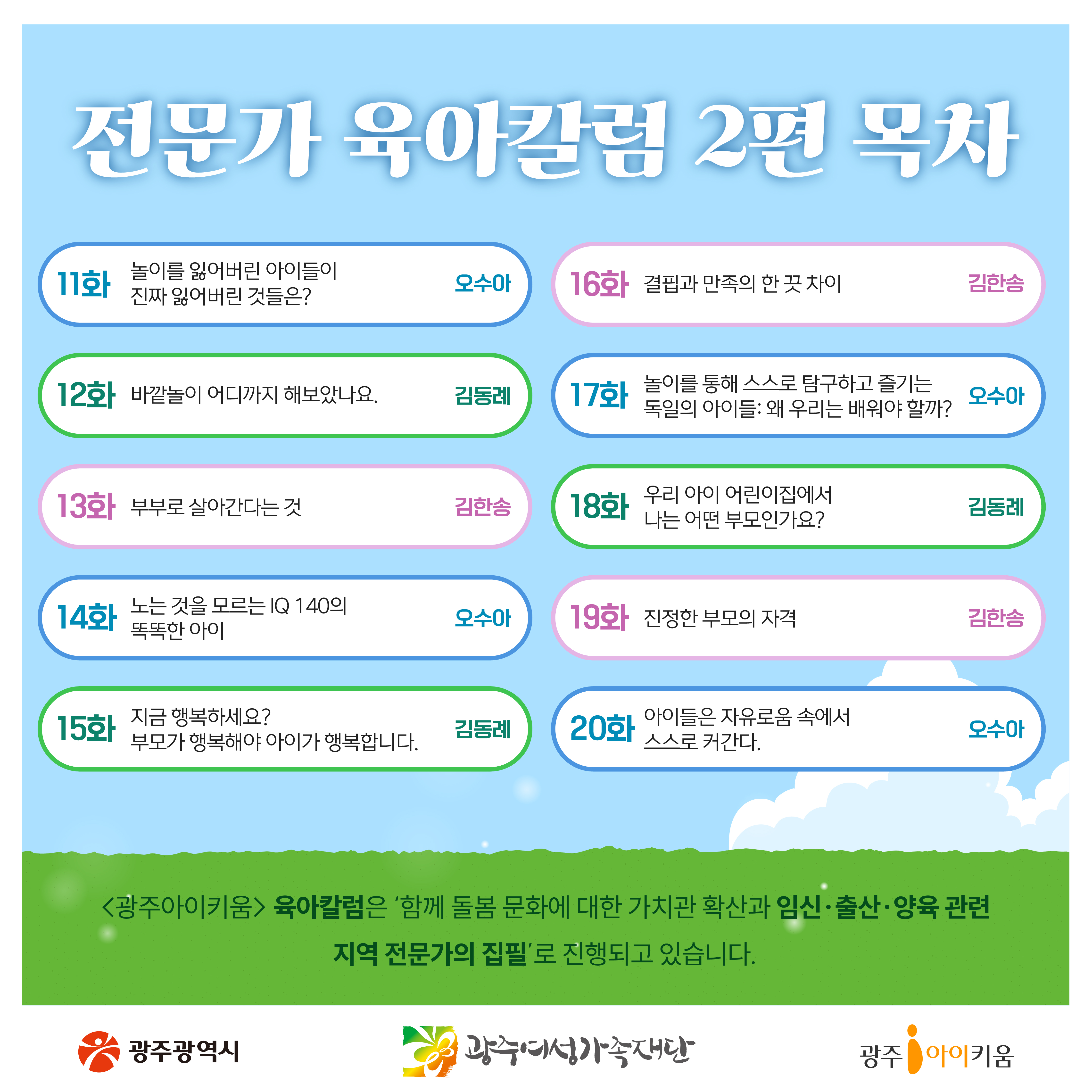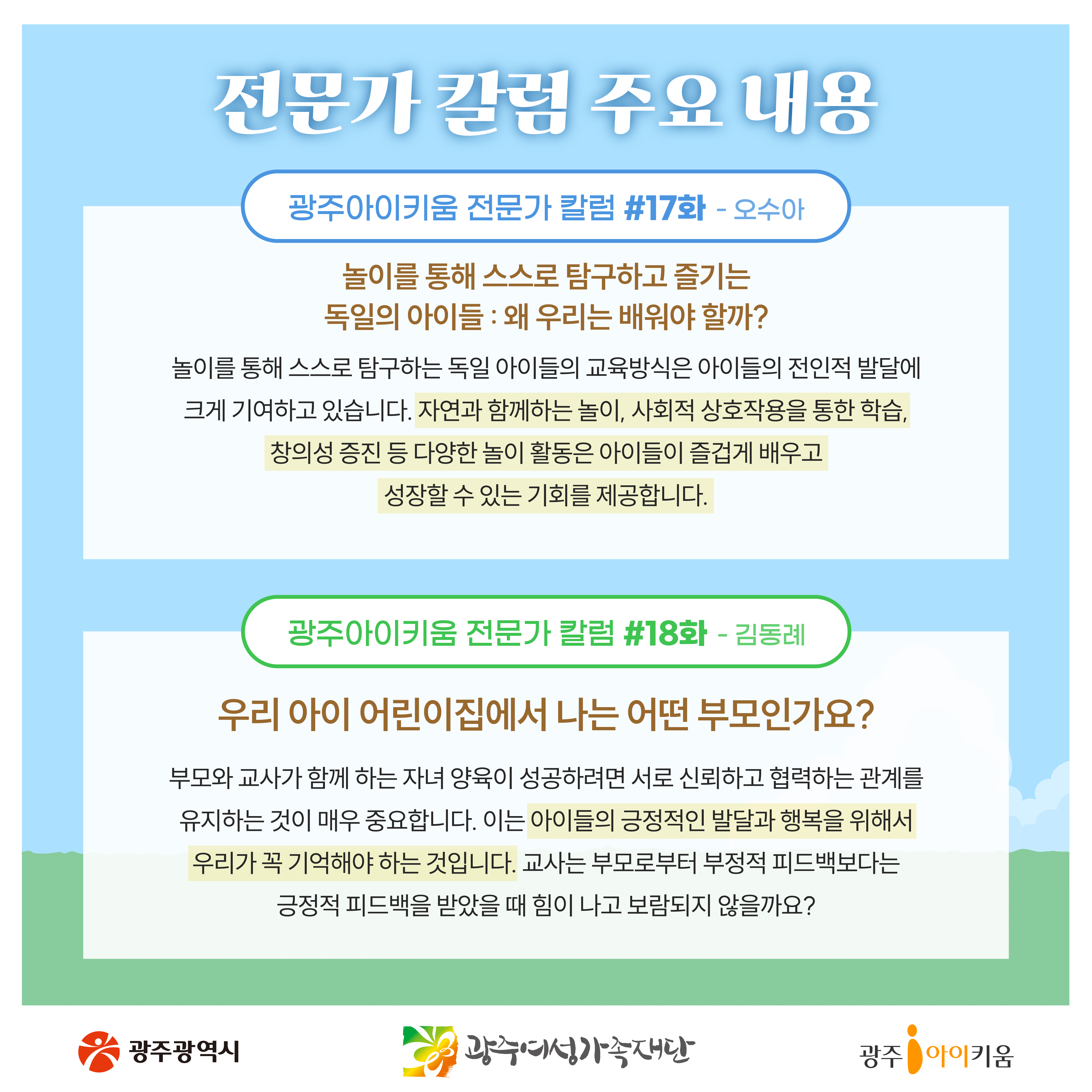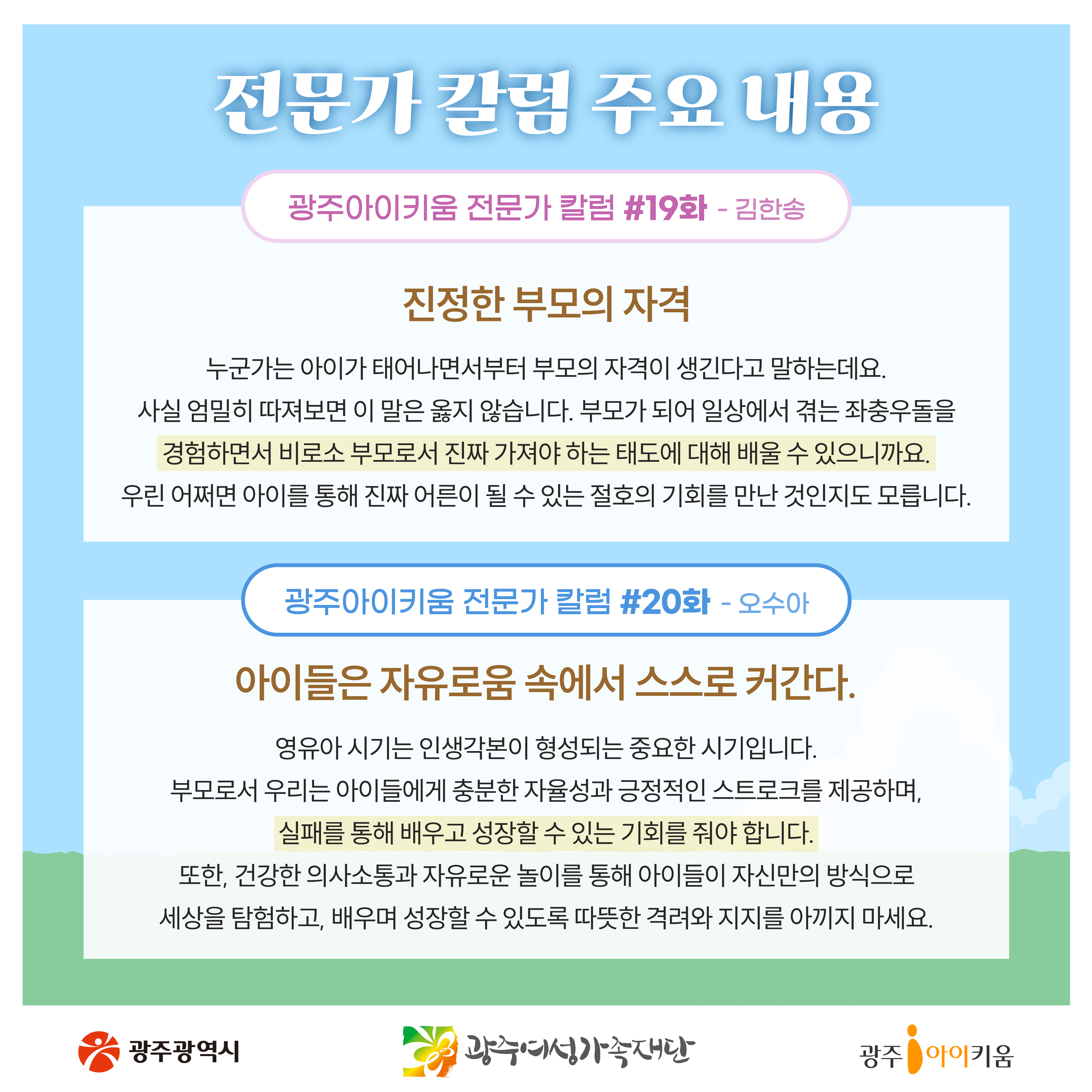 [돌봄같이 58호] 한눈에 보는 전문가 육아칼럼 소개 2번째 등록일 : 2024-08-27 08:53 작성자 : 운영자 조회수 : 394 첨부파일 KakaoTalk_20240822_130210171.jpg 다운로드 목록
