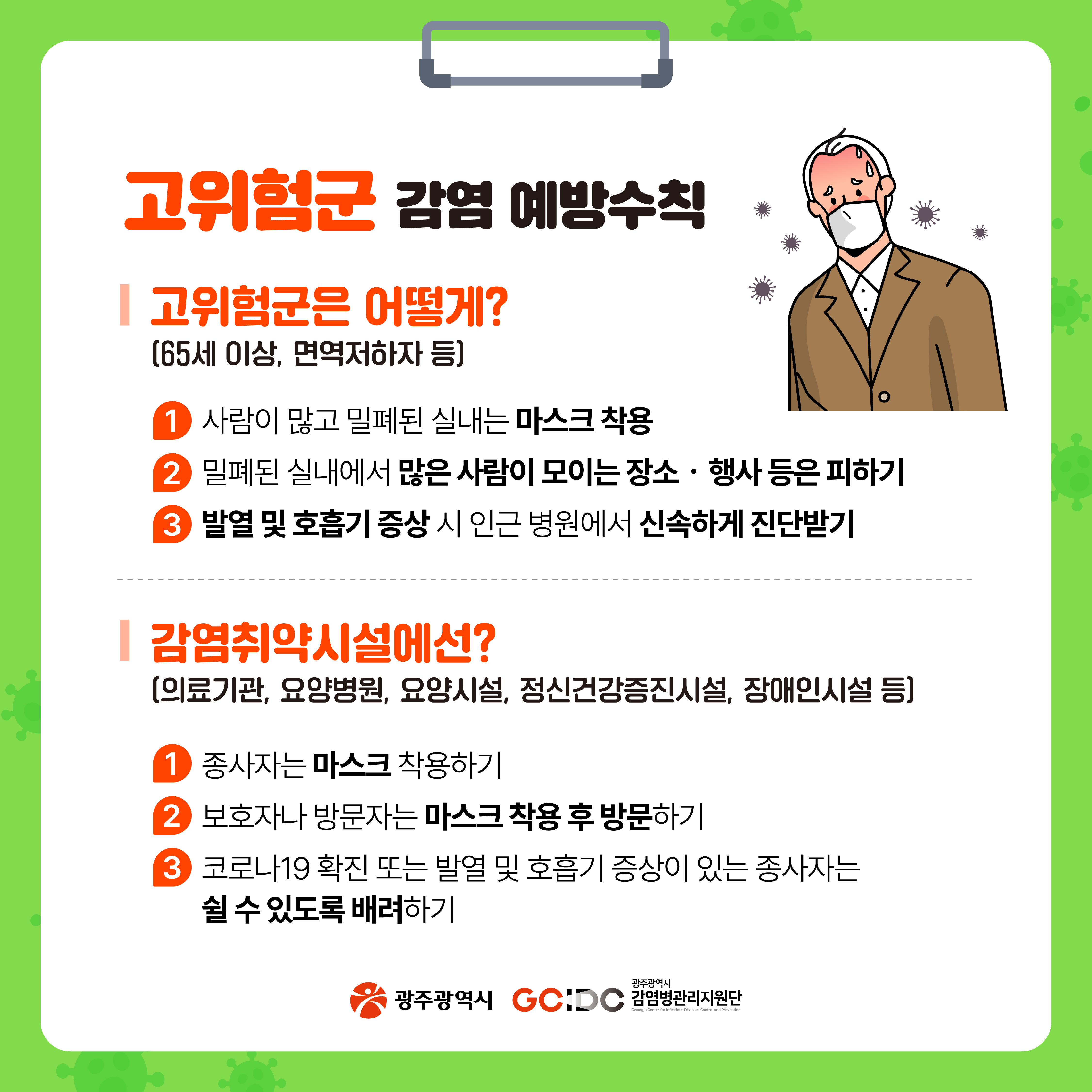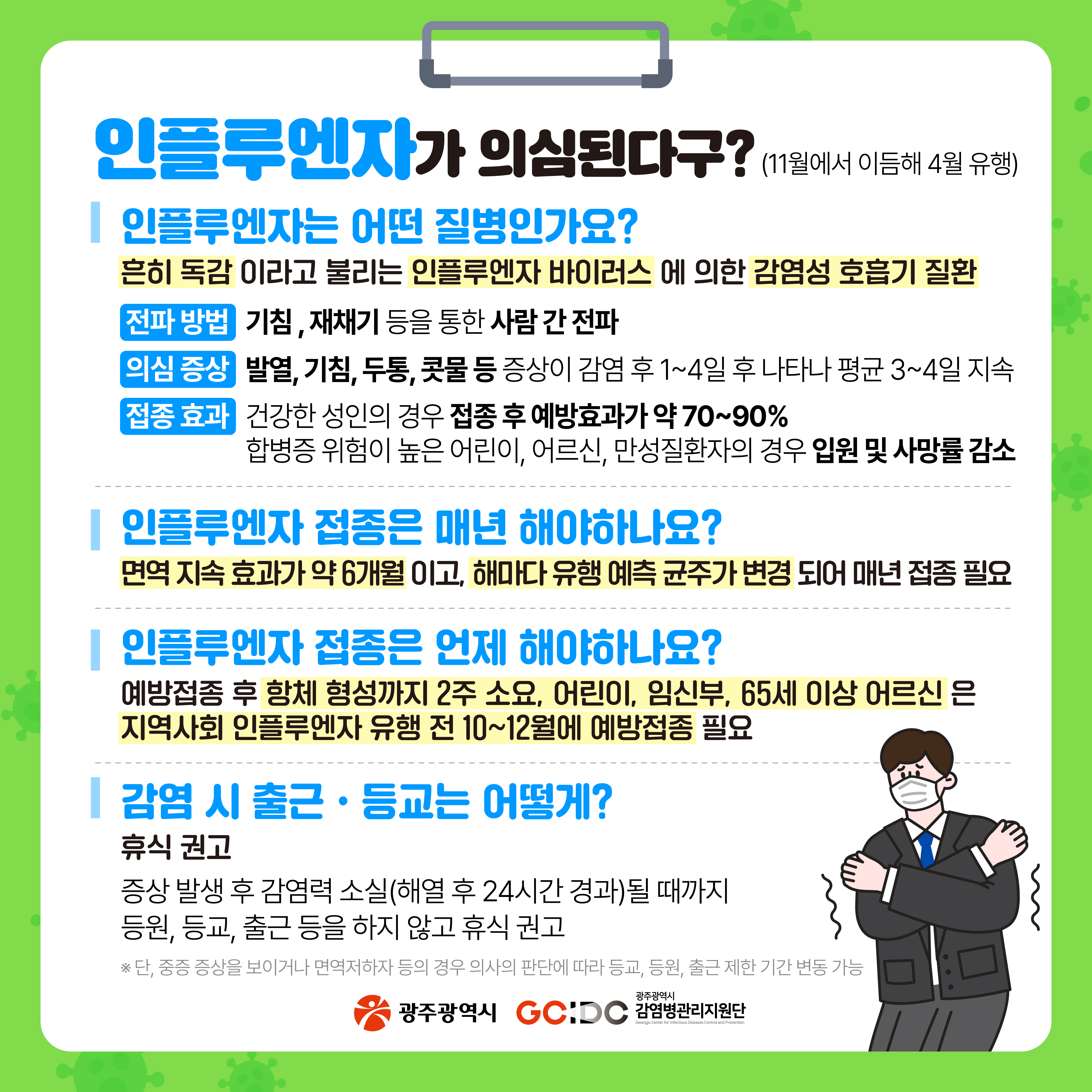 지속되는 호흡기 감염병, 일상에서도 호흡기 감염병 예방수칙을 지켜줘 등록일 : 2024-10-10 16:03 작성자 : 운영자 조회수 : 291 첨부파일 01.jpg 다운로드 [출처 : 광주광역시] 목록