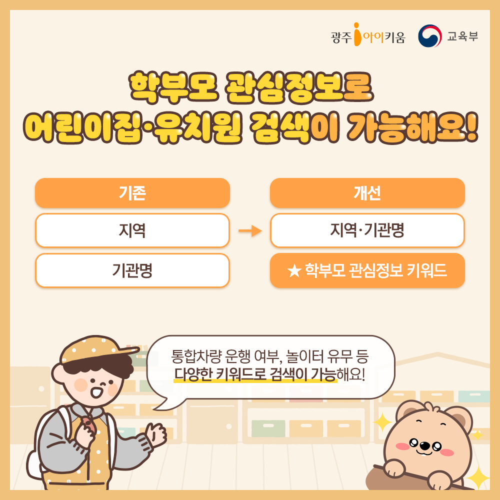 *통학차량 운행 여부, 놀이터 유무 등 다양한 키워드로 검색이 가능해요!