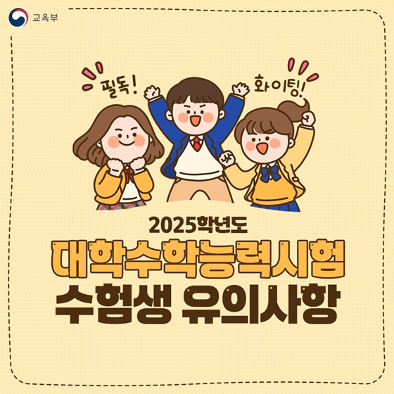 25학년도 대학수학능력시험 수험생이라면 알아두세요! 등록일 : 2024-11-04 15:34 작성자 : 운영자 조회수 : 298 첨부파일 제목을-입력해주세요_-001 (1).png 다운로드 [출처 : 교육부] 목록