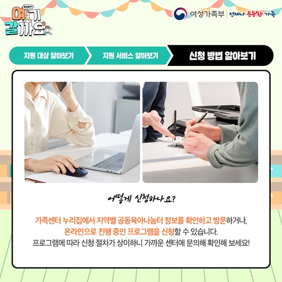 가족센터 누리집에서 지역별 공동육아나눔터 정보를 확인하고 방문하거나, 온라인으로 진행 중인 프로그램을 신청할 수 있습니다. 프로그램에 따라 신청 절차가 상이하니 가까운 센터에 문의해 확인해 보세요.