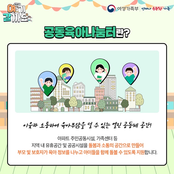 이웃과 소통하며 육아부담을 덜 수 있는 열린 공동체 공간입니다. 아파트 주민공동시설, 가족센터 등 지역 내 유휴공간 및 공공시설을 돌봄과 소통의 공간으로 만들어 부모 및 보호자가 육아 정보를 나누고 아이들을 함께 돌볼 수 있도록 지원합니다.