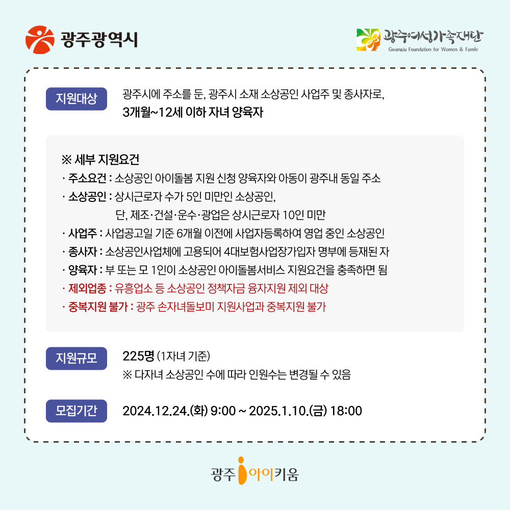 소상공인 육아응원패키지 ⸢소상공인 아이돌봄서비스 지원사업⸥ 등록일 : 2024-12-23 16:32 작성자 : 운영자 조회수 : 246 첨부파일 소상공인(1).jpg 다운로드 자세한 사항은 공지사항 소상공인 육아응원패키지 ⸢소상공인 아이돌봄서비스 지원사업⸥ 공고문을 확인해주시기 바랍니다. 목록