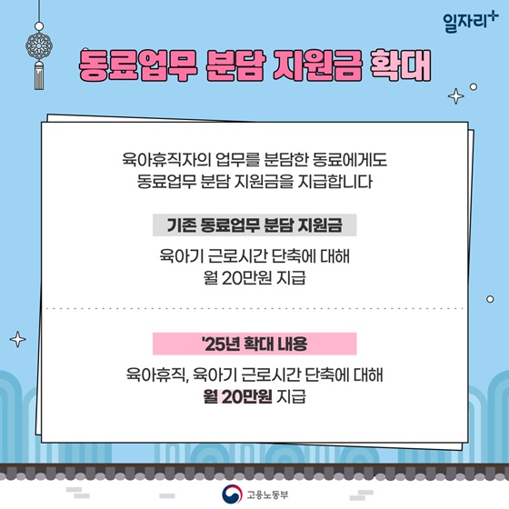 육아휴직자의 업무를 분담한 동료에게도 동료업무 분담 지원금을 지급합니다.