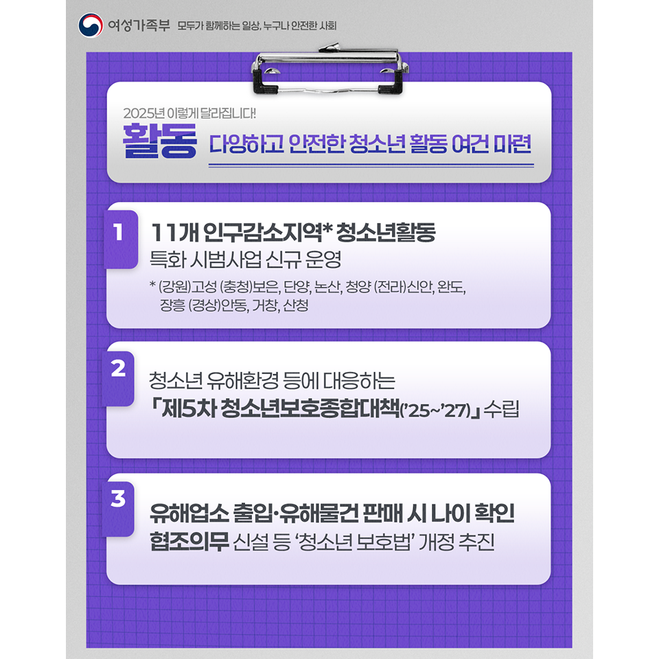 [여성가족부]촘촘한 가족,청소년 안전망 등록일 : 2025-02-07 08:13 작성자 : 운영자 조회수 : 130 첨부파일 1.png 다운로드 여성가족부 2025년 이렇게 달라집니다!촘촘한 가족, 청소년 안전망 입니다. 목록