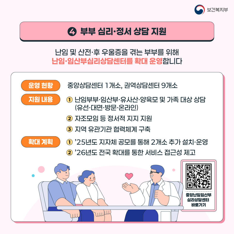 난임 및 산전·후 우울증을 겪는 부부를 위해 난임·임산부심리상담센터를 확대 운영합니다.