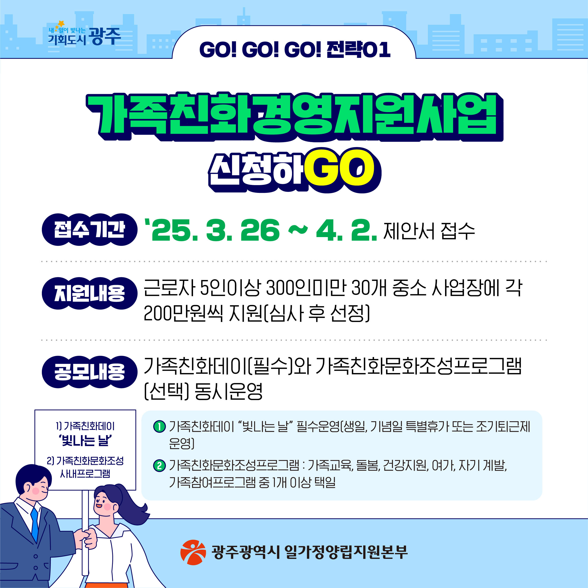 광주광역시만의 가족친화기업 전략 등록일 : 2025-03-25 16:48 작성자 : 운영자 조회수 : 116 첨부파일 광주광역시_가족친화기업_카드뉴스(최종)_1.jpg 다운로드 목록