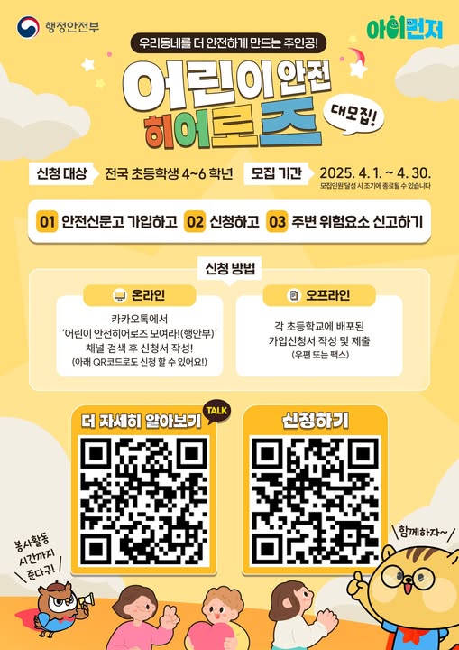 1) 온라인 : 카카오톡에서 '어린이 안전히어로즈 모여라!(행안부)' 채널 검색 후 신청서 작성 -> 큐알로도 신청가능