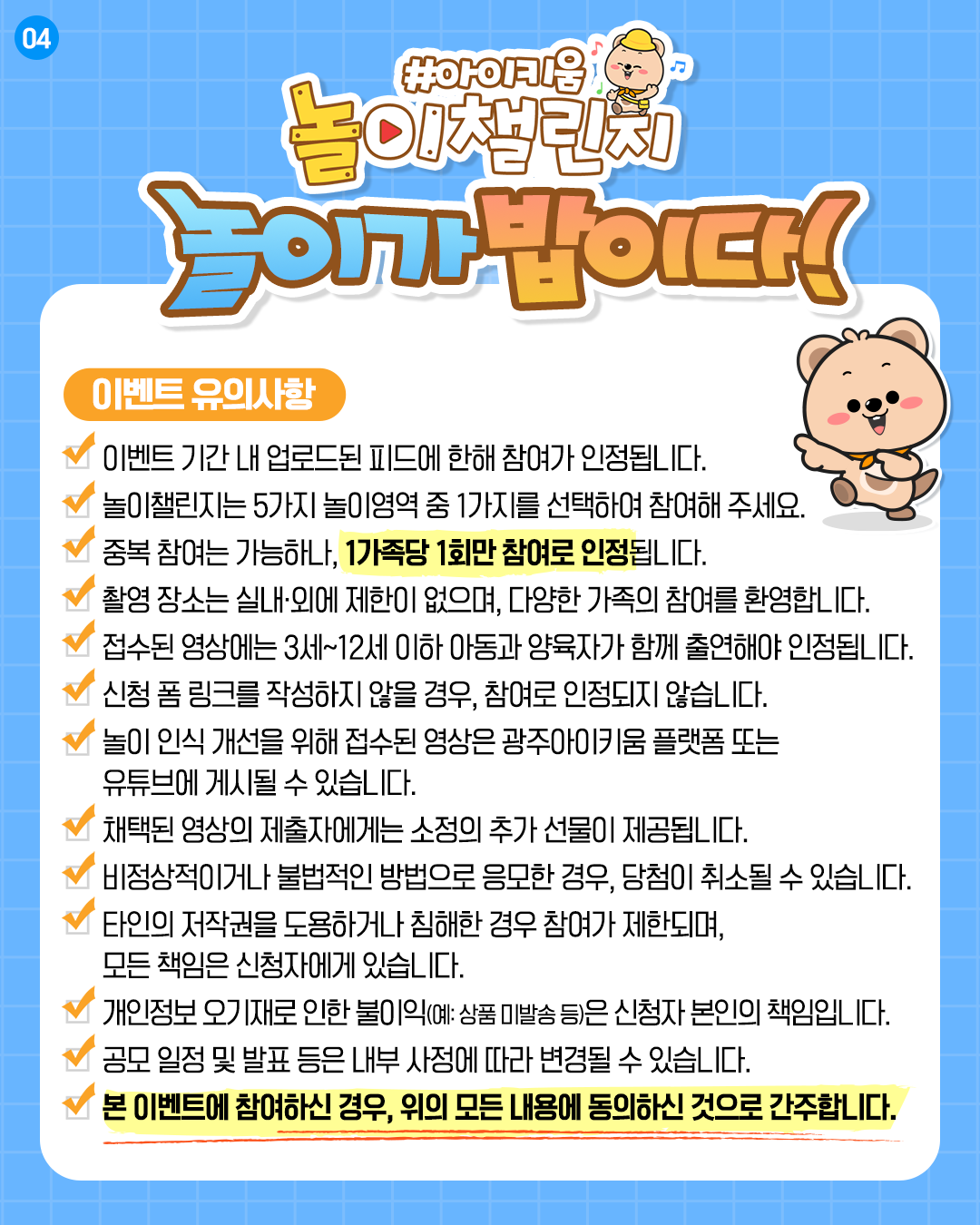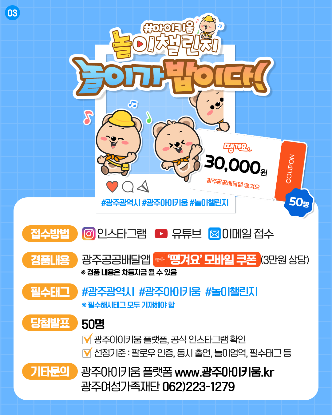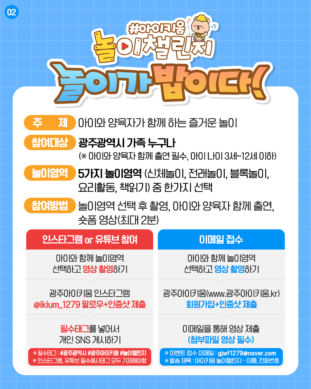 1)️ 인스타그램(유튜브) 영상 업로드 인증 선택 시 📍 광주아이키움 인스타그램 팔로우(@ikium_1279) 필수 * 팔로우 인증샷 제출 📍 아이와 함께 놀이 챌린지 진행 ( 신체놀이, 전래놀이, 블록놀이, 요리활동, 책읽기 중 선택 ) * 숏폼 영상(최대 2분) 📍 챌린지 영상을 본인의 SNS(인스타그램, 유튜브 등)에 게시 * 전체공개 필수, 타인의 영상 도용 금지 * #광주광역시 #광주아이키움 #놀이챌린지 위 필수 해시태그를 꼭! 포함해서 게시해주세요! 2) 이메일 영상 제출 선택 시 📍 광주아이키움 회원가입 필수 * 회원 가입 인증샷 제출 📍 아이와 함께 놀이 챌린지 진행 ( 신체놀이, 전래놀이, 블록놀이, 요리활동, 책읽기 중 선택 ) * 숏폼 영상(최대 2분) 📍 챌린지 영상을 이메일로 제출해주세요 * 이벤트 접수 이메일 : gjwf1279@naver.com * 메일 발송 제목 : "아이키움 놀이챌린지 이름 ㅁㅁㅁ 연락처 000-0000-0000" 우리 아이랑 노는 영상도 찍고, 쿠폰도 받고! 여러분의 많은 관심과 참여 부탁드립니다🧡