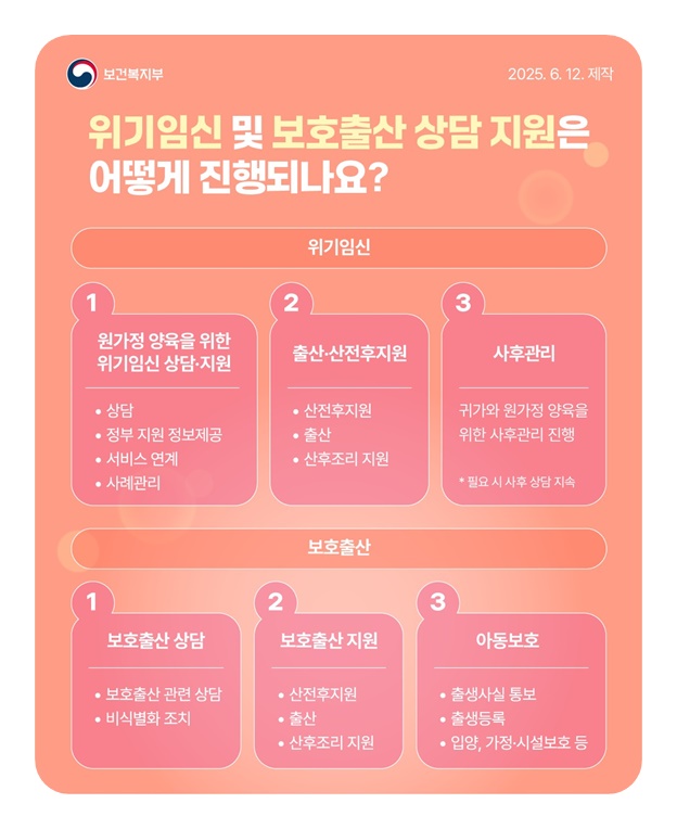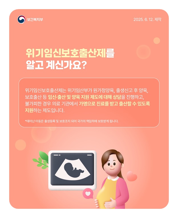 위기임신보호출산제는 위기임산부가 원가정양육, 출생신고 후 양육, 보호출산 등 임신·출산 및 양육 지원 제도에 대해 상담을 진행하고, 불가피한 경우 의료 기관에서 가명으로 진료를 받고 출산할 수 있도록 지원하는 제도입니다.