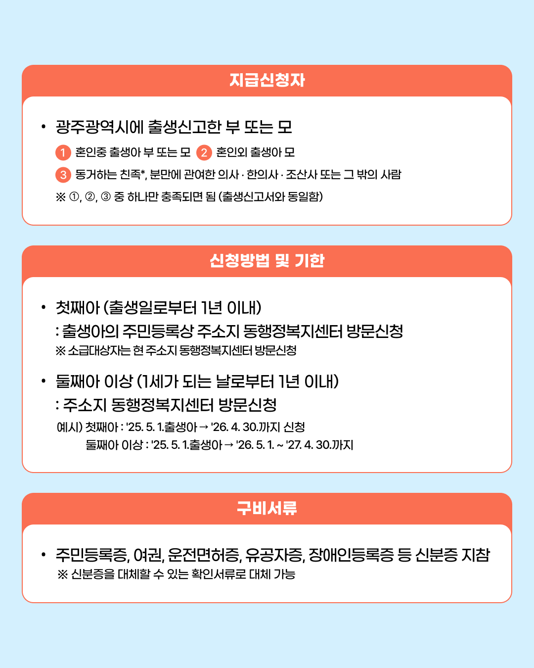 양육 가정의 부담을 덜어주고 지역경제를 활성화하기 위해 광주광역시에 출생신고를 한 2025년 출생아 가정에 1인당 50만 원의 '출생가정 축하 상생카드' 지원을 합니다.