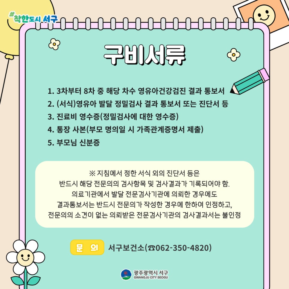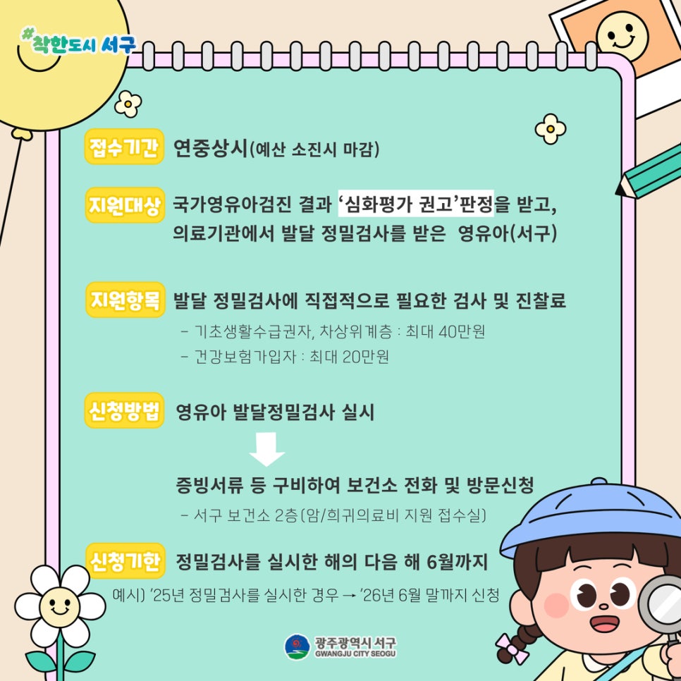 영유아 발달 정밀 검사비 지원안내 등록일 : 2025-08-21 14:38 작성자 : 운영자 조회수 : 76 첨부파일 20250821.jpg 다운로드 [출처 : 광주광역시 서구청] 목록