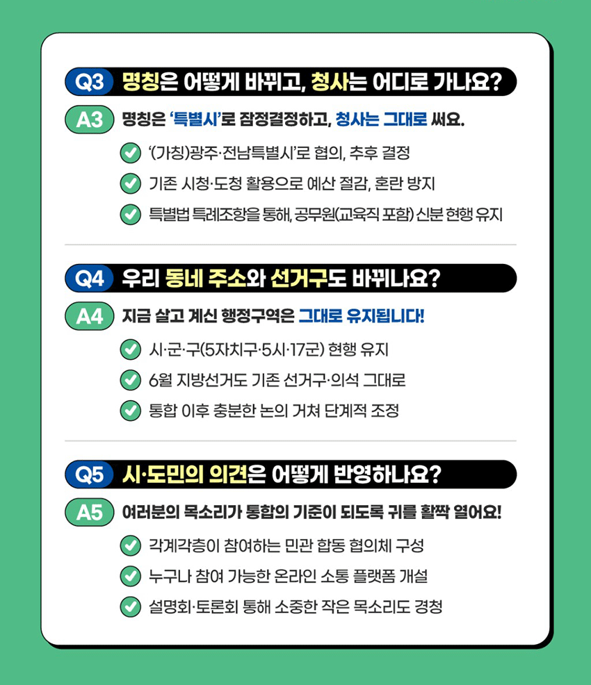 home 맘편한 내★일, 광주아이키움2.0 결혼·임신·출생 영유아 초·중·고 다양한 가족 일생활균형 커뮤니티 아동돌봄지원 소통방 나눔방 광주 아이키움 상담방 돌봄정보방 성폭력 피해 상담 및 사건지원 공지사항 이벤트소식 참여게시판 카드뉴스 동영상 아이키움 칼럼 성평등 육아웹툰 로고&캐릭터 광주·전남 행정통합 등록일 : 2026-02-12 15:08 작성자 : 운영자 조회수 : 4 첨부파일 1.gif 다운로드 광주·전남 행정통합 궁금증을 풀어드립니다. 목록