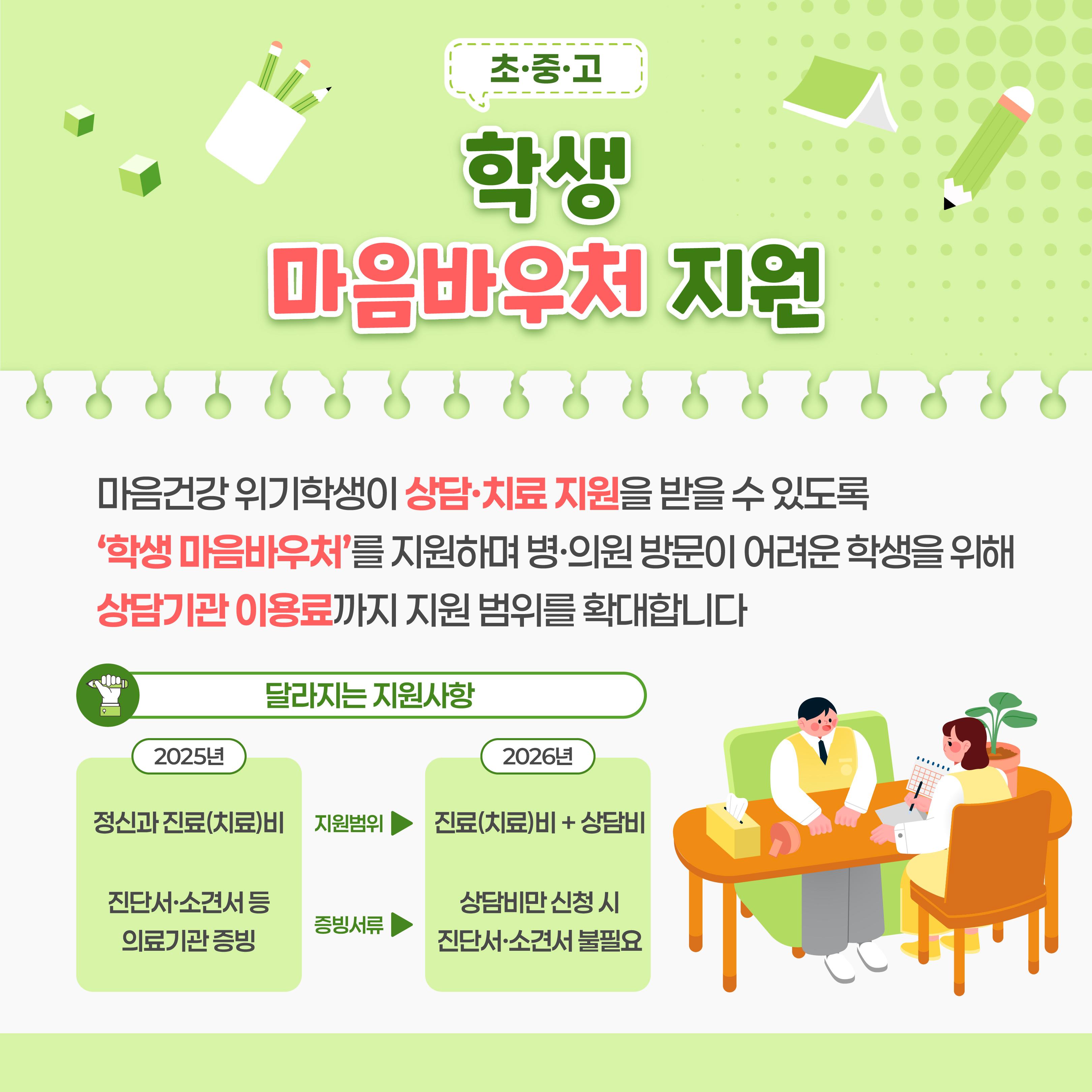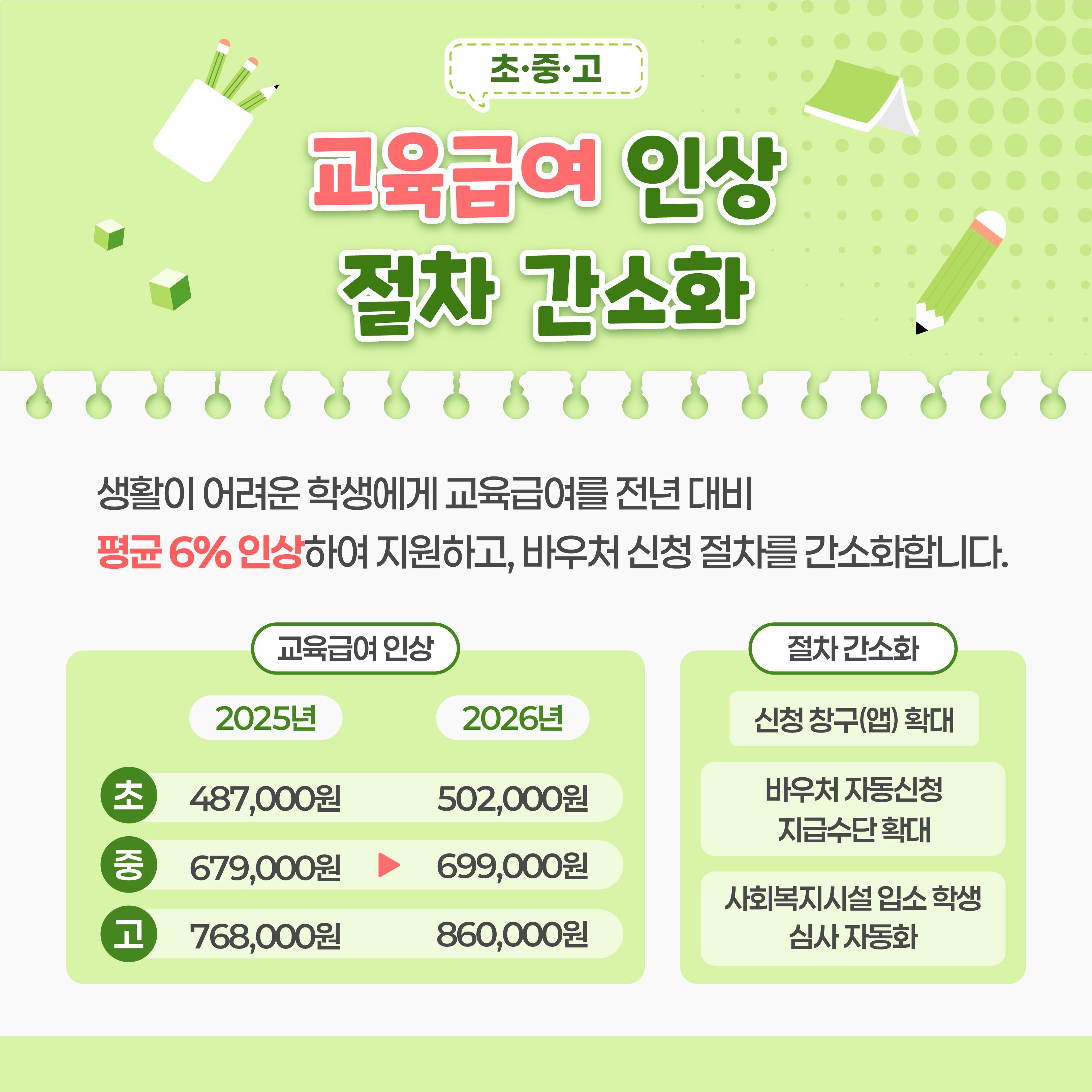 home 맘편한 내★일, 광주아이키움2.0 결혼·임신·출생 영유아 초·중·고 다양한 가족 일생활균형 커뮤니티 아동돌봄지원 소통방 나눔방 광주 아이키움 상담방 돌봄정보방 성폭력 피해 지원 안내 공지사항 이벤트소식 참여게시판 카드뉴스 동영상 아이키움 칼럼 성평등 육아웹툰 로고&캐릭터 [교육부] 2026년 학생 지원 이렇게 확대됩니다! 등록일 : 2026-03-23 10:49 작성자 : 운영자 조회수 : 20 첨부파일 2.+정책의+온도+1.jpg 다운로드 모든 학생이 행복한 교육환경 조성을 위해 2026년 학생 지원, 이렇게 확대됩니다! 학생을 위한 정책의 온도 앞으로도 생활 속 교육정책을 쉽고 빠르게! 알려드릴게요! [출처: 교육부] 목록