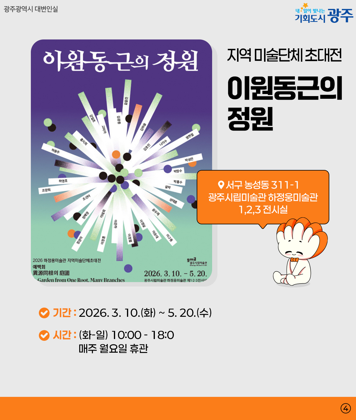 home 맘편한 내★일, 광주아이키움2.0 결혼·임신·출생 영유아 초·중·고 다양한 가족 일생활균형 커뮤니티 아동돌봄지원 소통방 나눔방 광주 아이키움 상담방 돌봄정보방 성폭력 피해 지원 안내 공지사항 이벤트소식 참여게시판 카드뉴스 동영상 아이키움 칼럼 성평등 육아웹툰 로고&캐릭터 광주 WEEK 3월 4주차 여기 가려고 일주일을 기다렸어 등록일 : 2026-03-26 15:37 작성자 : 운영자 조회수 : 9 첨부파일 1.jpeg 다운로드 출처:광주광역시 목록