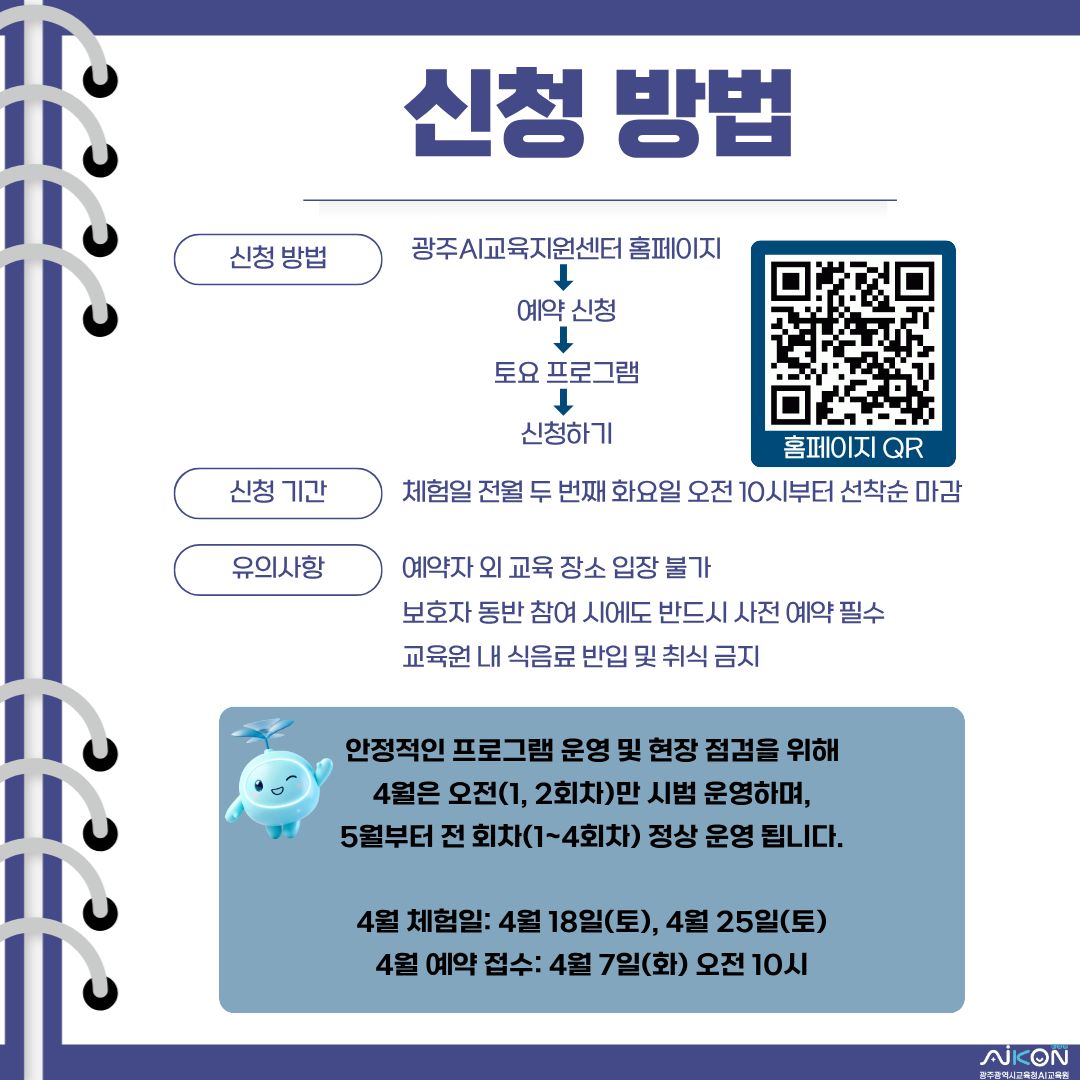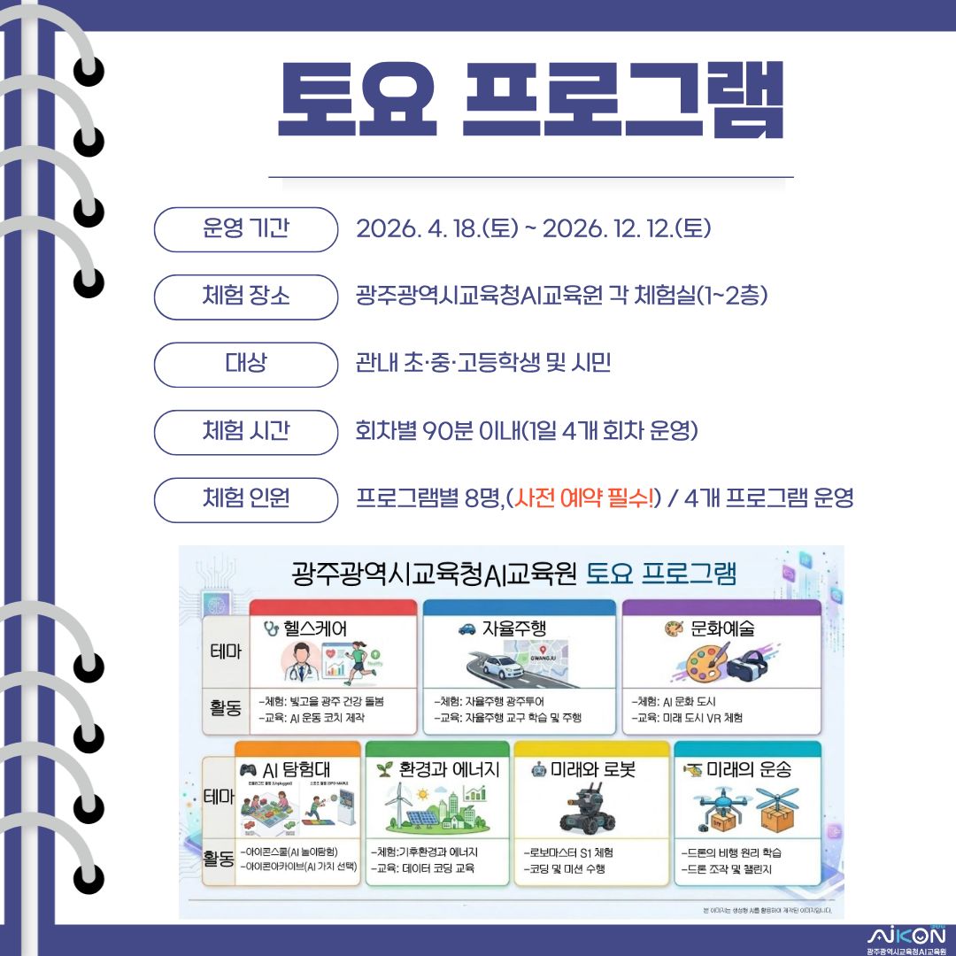 home 맘편한 내★일, 광주아이키움2.0 결혼·임신·출생 영유아 초·중·고 다양한 가족 일생활균형 커뮤니티 아동돌봄지원 소통방 나눔방 광주 아이키움 상담방 돌봄정보방 성교육 기관·도서 안내 공지사항 이벤트소식 참여게시판 카드뉴스 동영상 아이키움 칼럼 성평등 육아웹툰 로고&캐릭터 토요일엔 AI 만나러가는 날 등록일 : 2026-04-02 11:08 작성자 : 운영자 조회수 : 88 첨부파일 1.jpg 다운로드 🎉 2026년 개원 소식을 알려드립니다. 광주 시민 누구나 함께하는 AI교육을 위해 토요일에 전시체험과 연계한 교육 프로그램을 운영합니다. 2026. 4. 18.~ 2026. 12. 12. 문의: 광주광역시교육청AI교육원 062-519-0463 목록