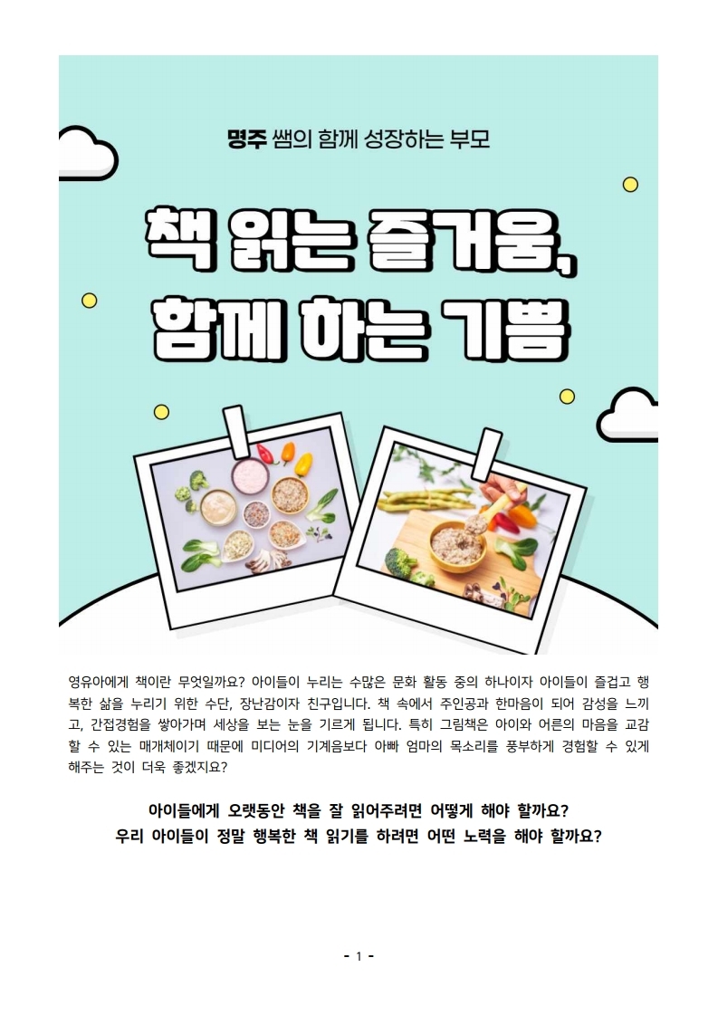 <명주쌤과 함께하는 이유식 레시피 20편> 책 읽는 즐거움, 함께 하는 기쁨 등록일 : 2021-07-15 17:05 카테고리 : 카테고리 없음 작성자 : 운영자 조회수 : 1741 목록
