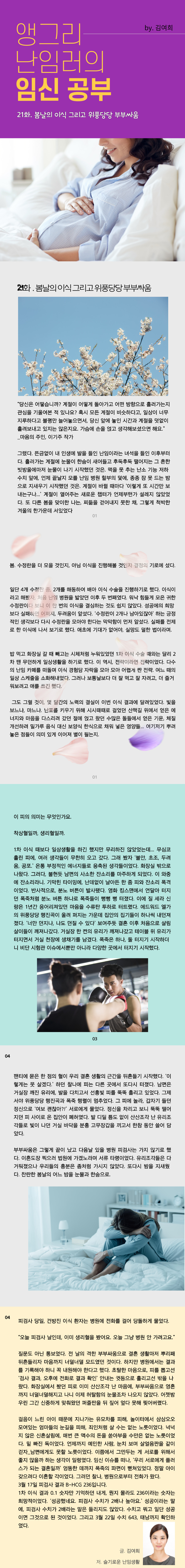 <앵그리 난임러의 임신공부> 21. 봄날의 이식 그리고 위풍당당 부부싸움 등록일 : 2021-10-06 15:18 카테고리 : 카테고리 없음 작성자 : 운영자 조회수 : 1596 목록
