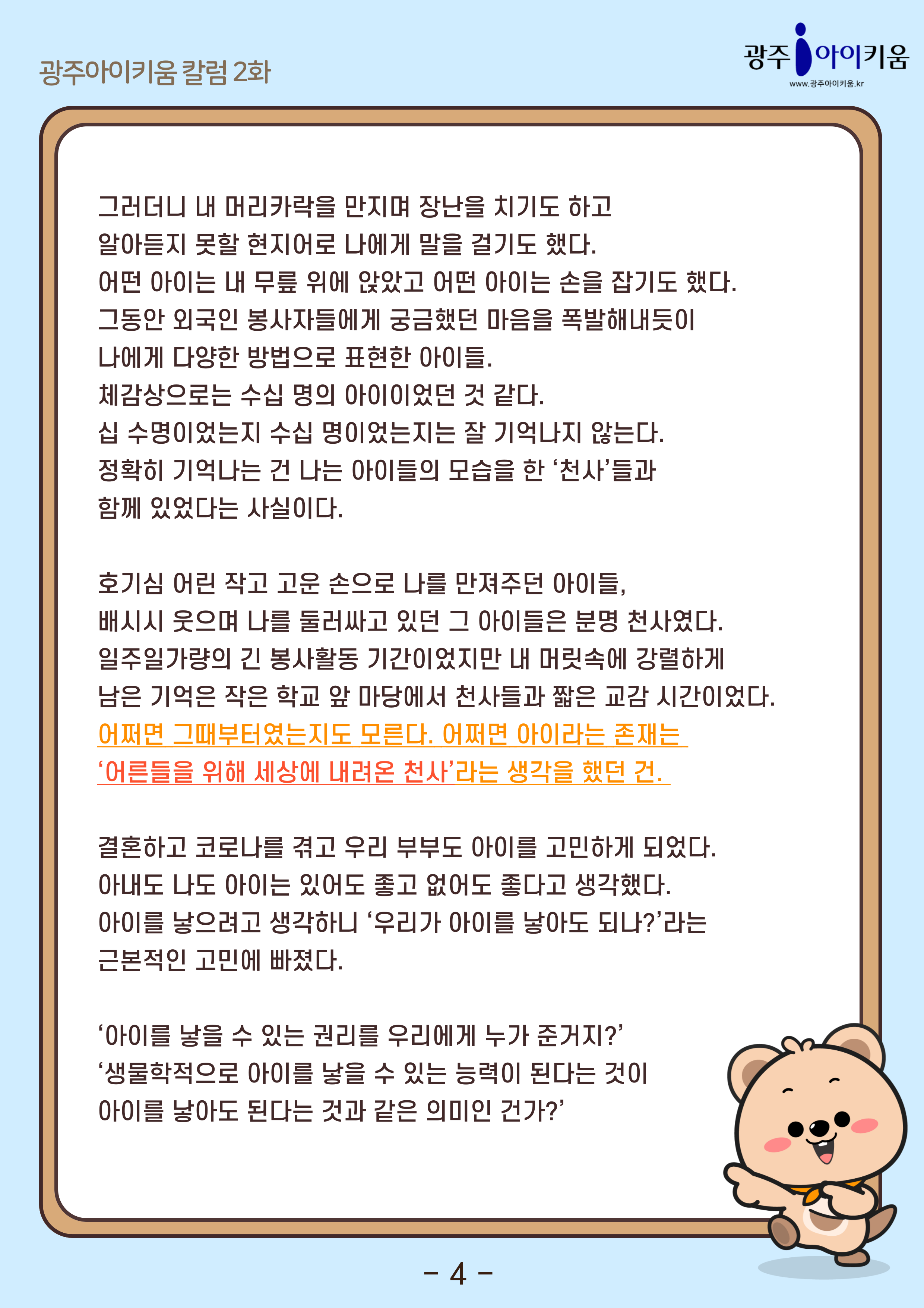 [육아칼럼] 2화 - 프롤로그 : 좋은 아빠라는 꿈 등록일 : 2025-02-13 16:02 카테고리 : 카테고리 없음 작성자 : 운영자 조회수 : 321 첨부파일 2025-칼럼-표지_파더스-001.png 다운로드 목록