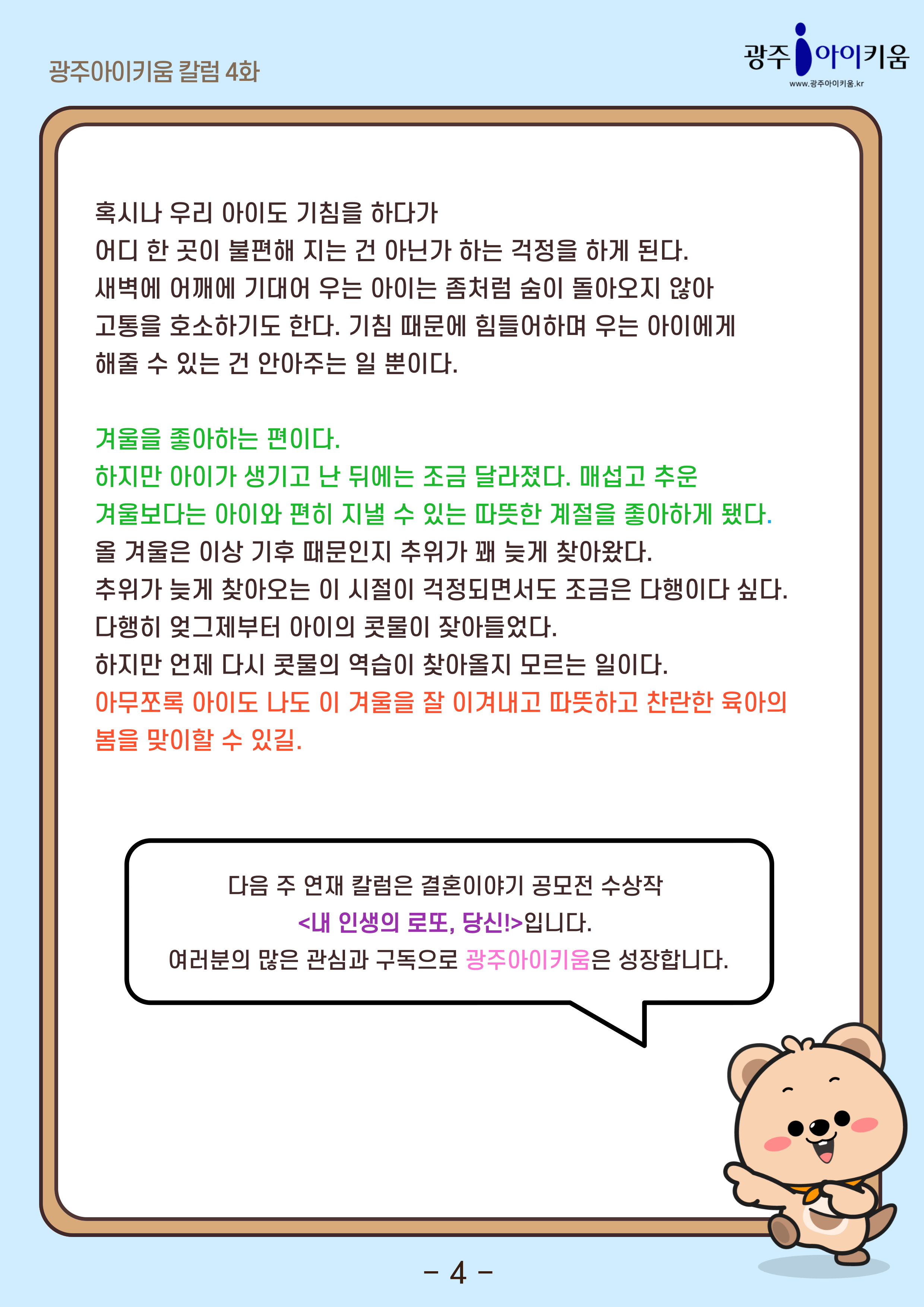 [육아칼럼] 4화 - 육아의 봄 등록일 : 2025-02-27 12:58 카테고리 : 카테고리 없음 작성자 : 운영자 조회수 : 247 첨부파일 2025-칼럼-표지_파더스-001.png 다운로드 목록