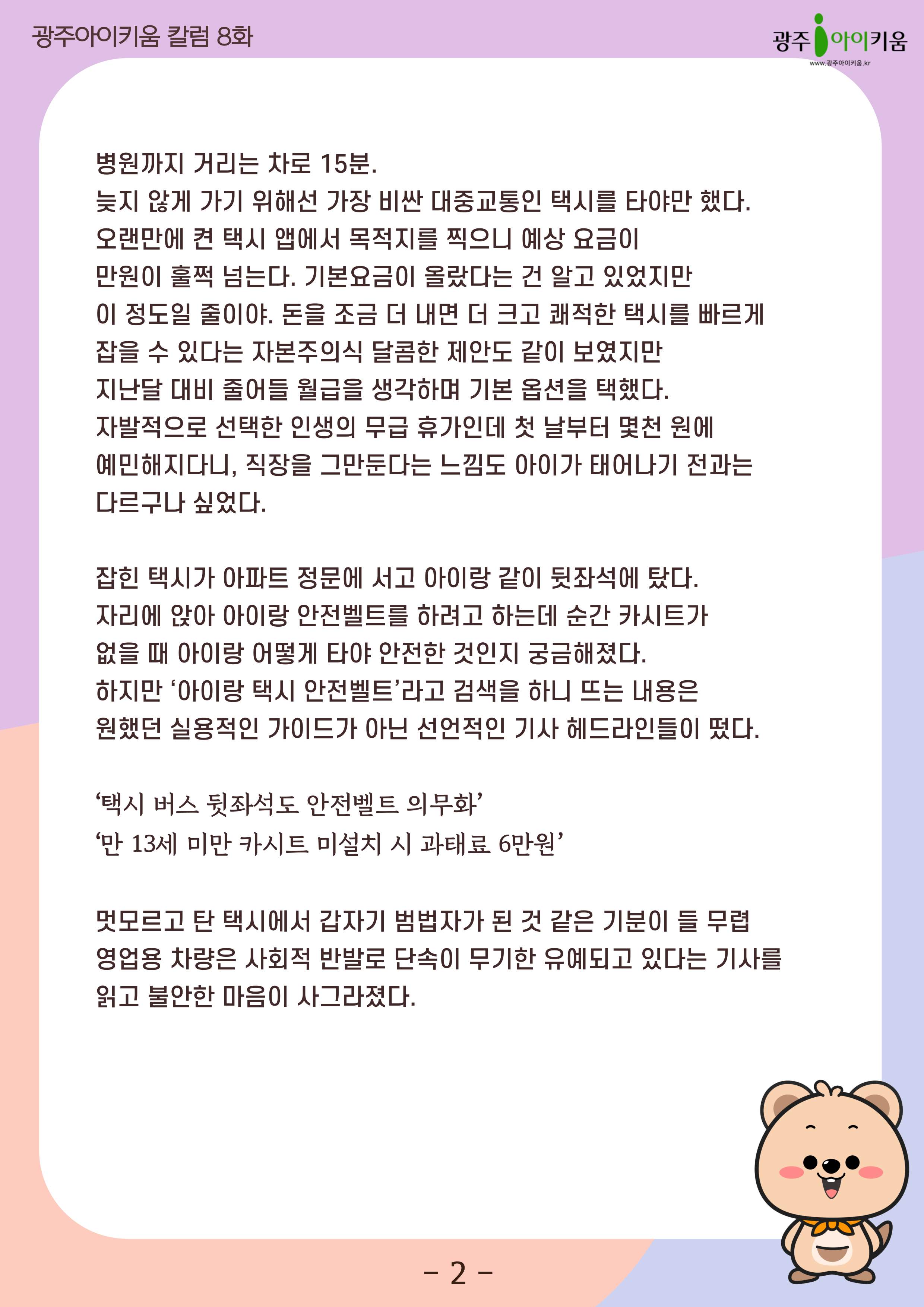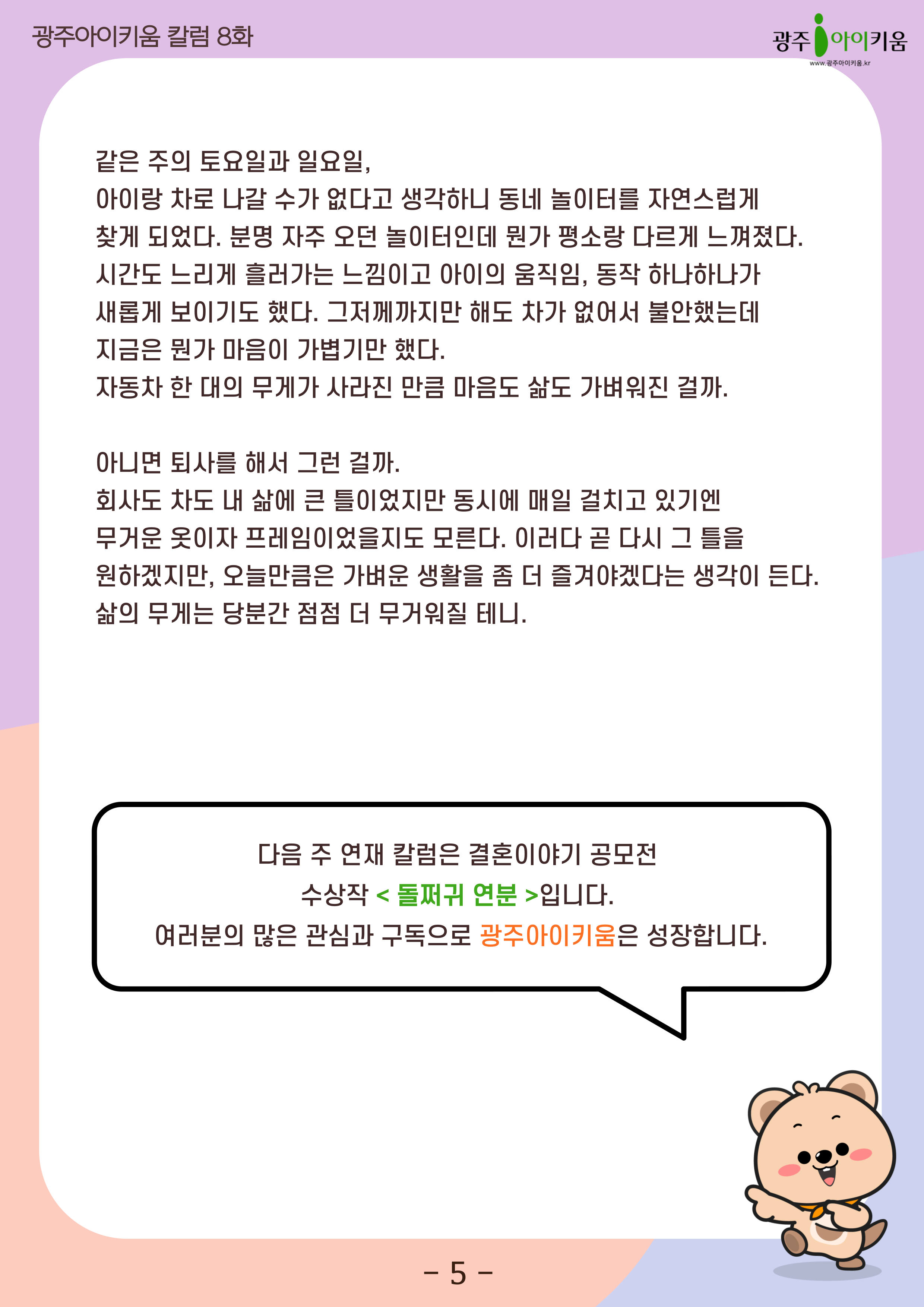 [육아칼럼] 8화 - 차가 없으니 보이는 것들 등록일 : 2025-03-28 09:31 카테고리 : 카테고리 없음 작성자 : 운영자 조회수 : 231 첨부파일 000.png 다운로드 목록