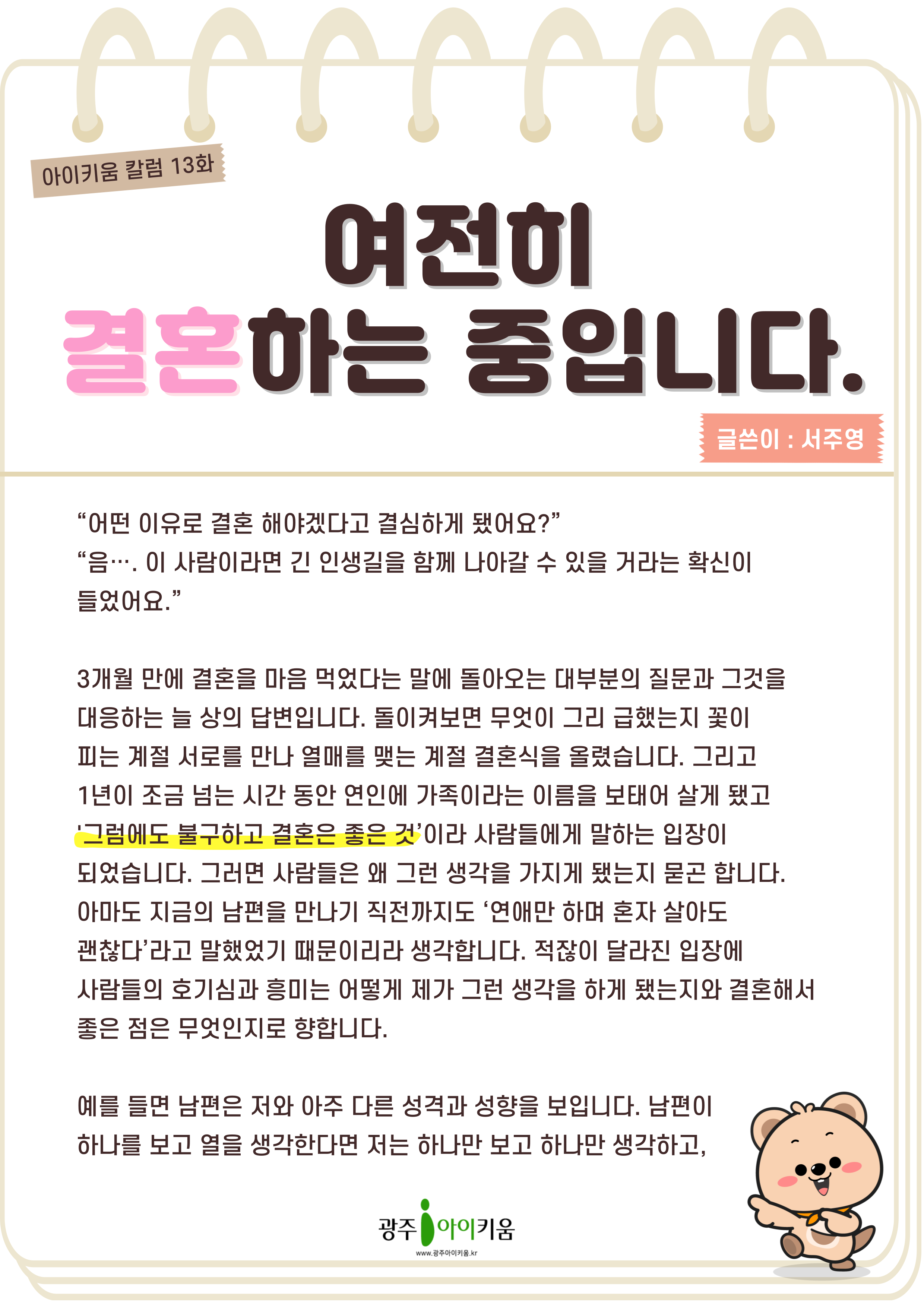 [육아칼럼] 13화 - 여전히 결혼하는 중입니다. 등록일 : 2025-04-30 12:57 카테고리 : 카테고리 없음 작성자 : 운영자 조회수 : 195 첨부파일 2025-칼럼-13화.png 다운로드 목록