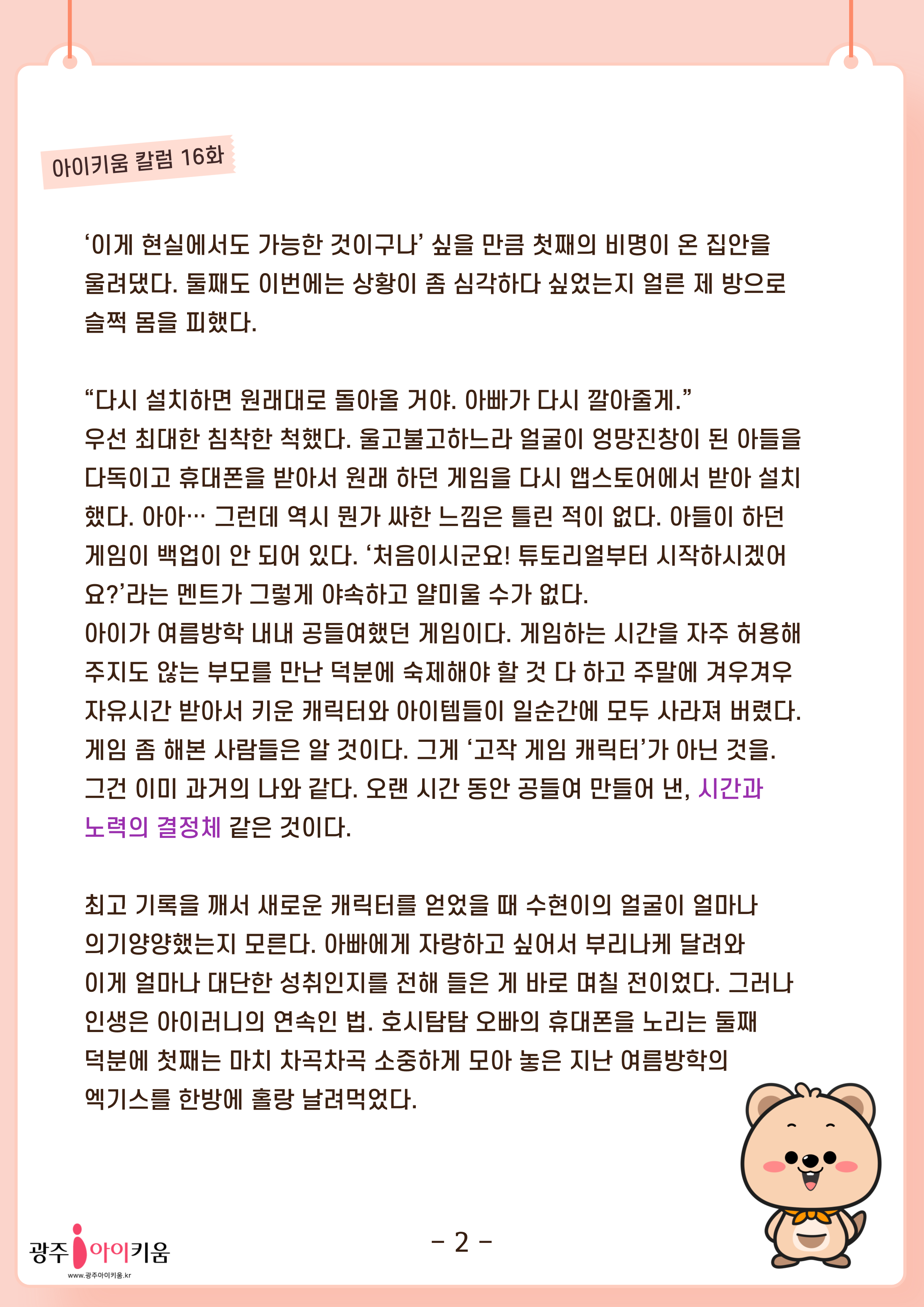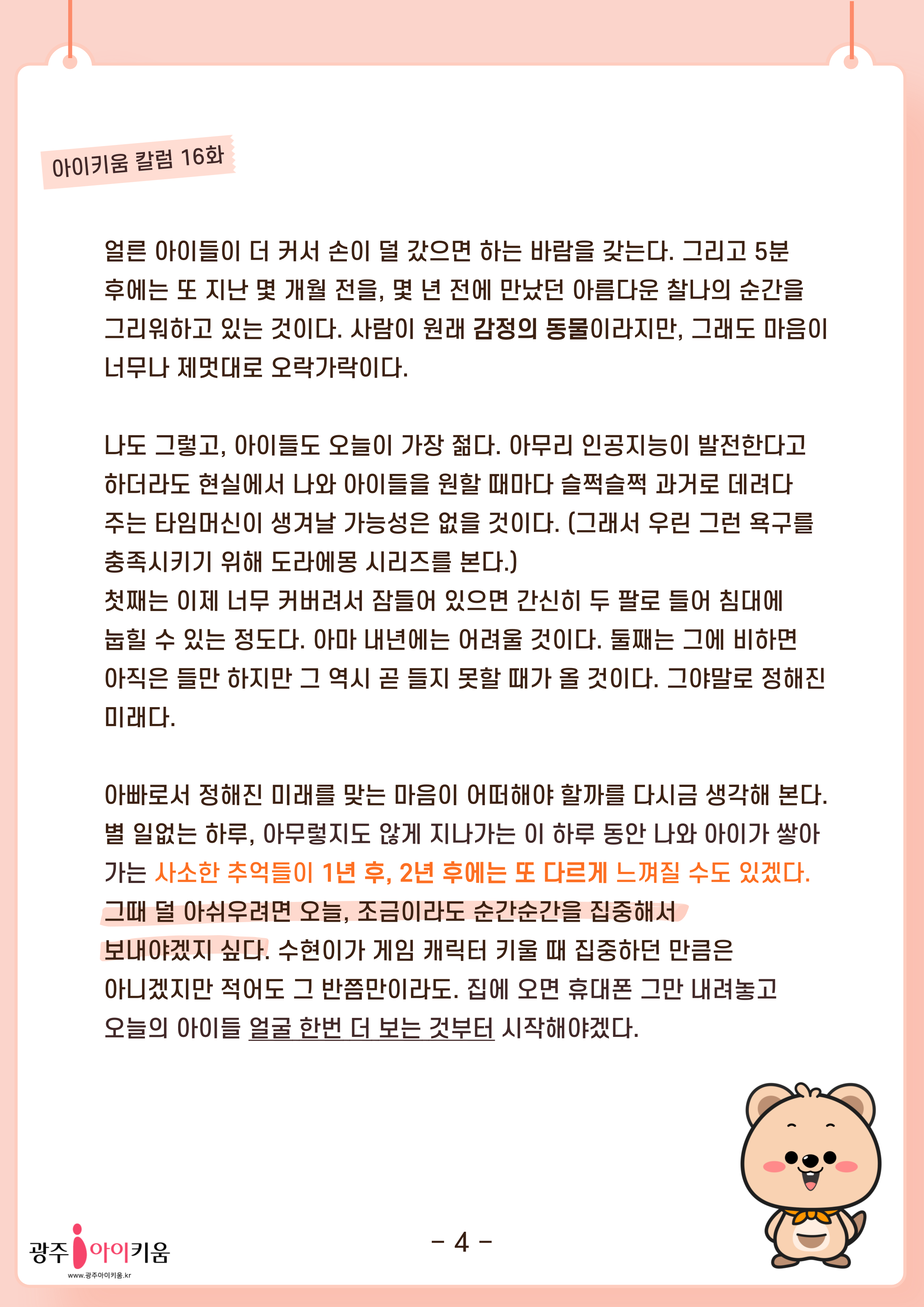 [육아칼럼] 16화 - 시간을 뒤로 돌릴 수 있다면 좋겠지만 등록일 : 2025-05-23 10:09 카테고리 : 카테고리 없음 작성자 : 운영자 조회수 : 126 첨부파일 2025-칼럼-_파더스 16화.png 다운로드 목록