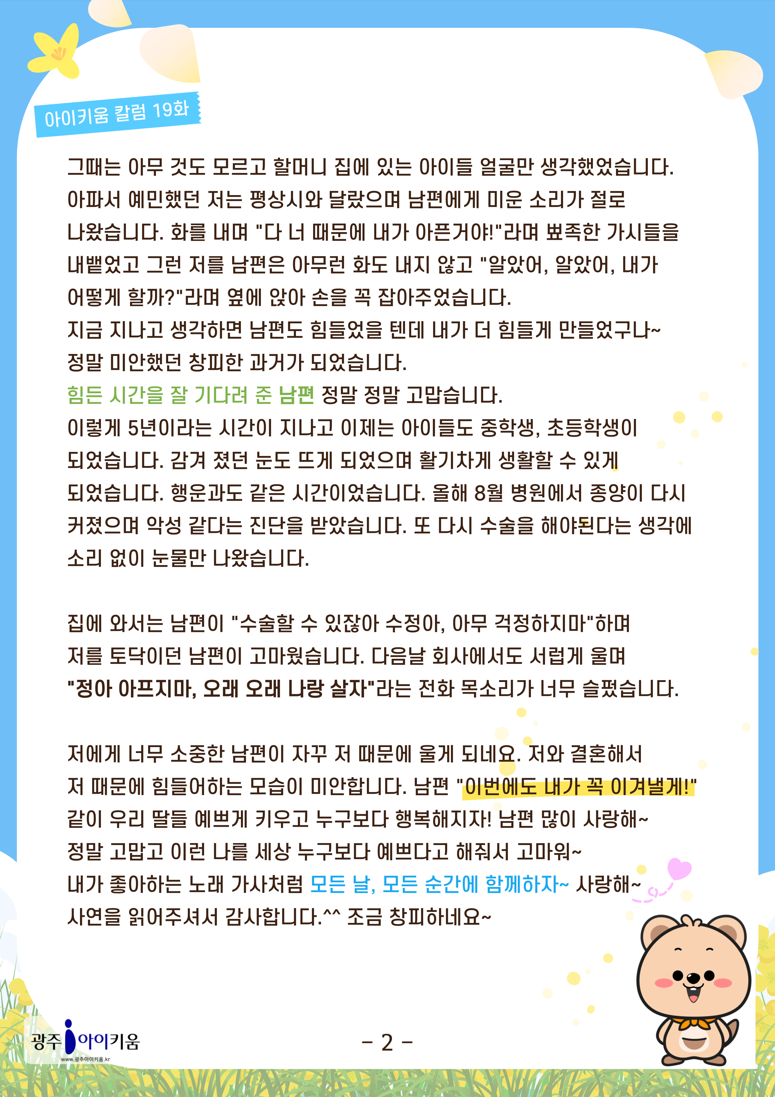 [육아칼럼] 19화 - 모든 날 모든 순간 힘이 되어준 남편에게 등록일 : 2025-06-12 13:38 카테고리 : 카테고리 없음 작성자 : 운영자 조회수 : 101 첨부파일 2025-칼럼-_공모전-002.png 다운로드 목록