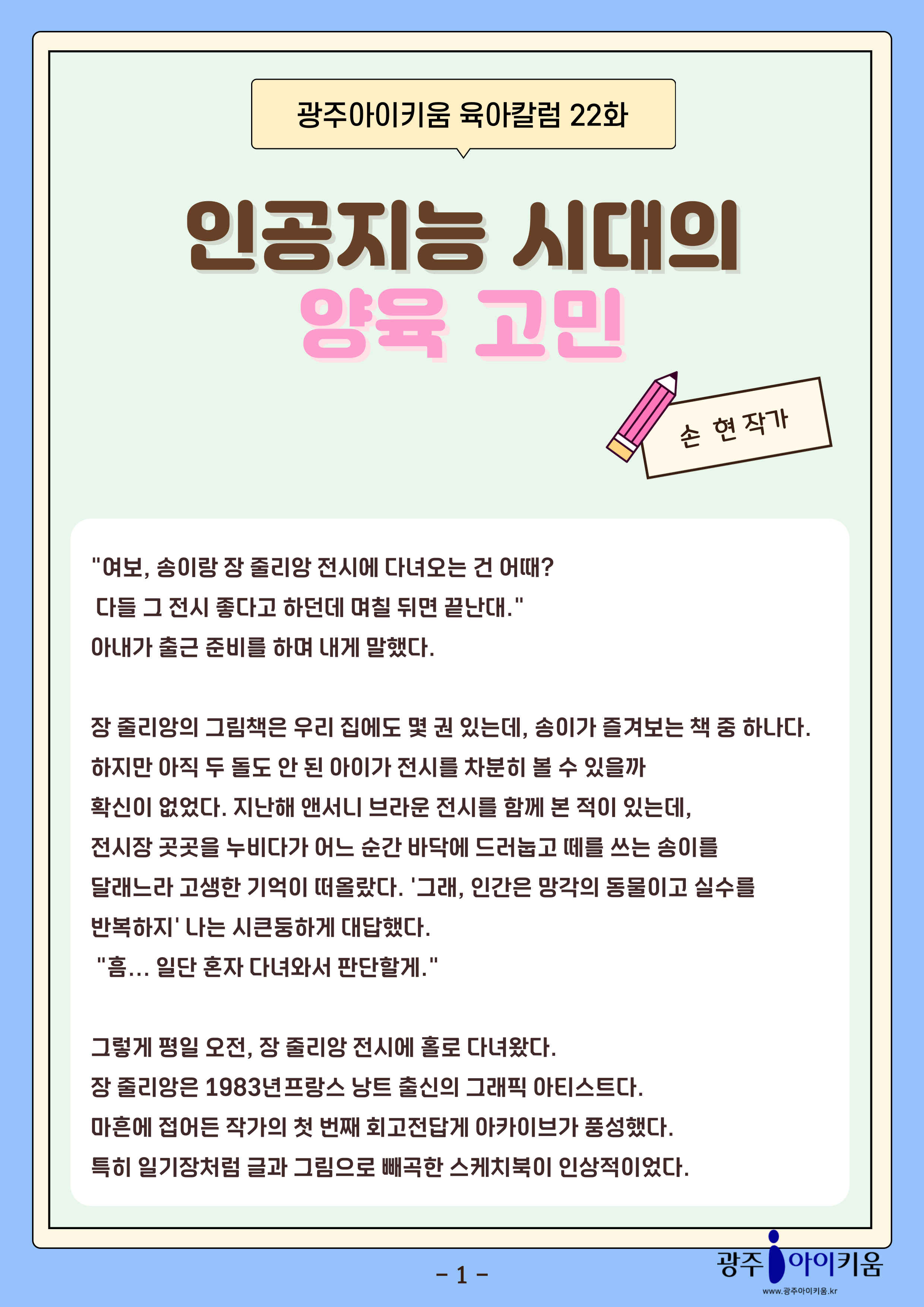 [육아칼럼] 22화 - 인공지능시대의 양육고민 등록일 : 2025-07-04 10:53 카테고리 : 카테고리 없음 작성자 : 운영자 조회수 : 107 첨부파일 000 (1).png 다운로드 목록