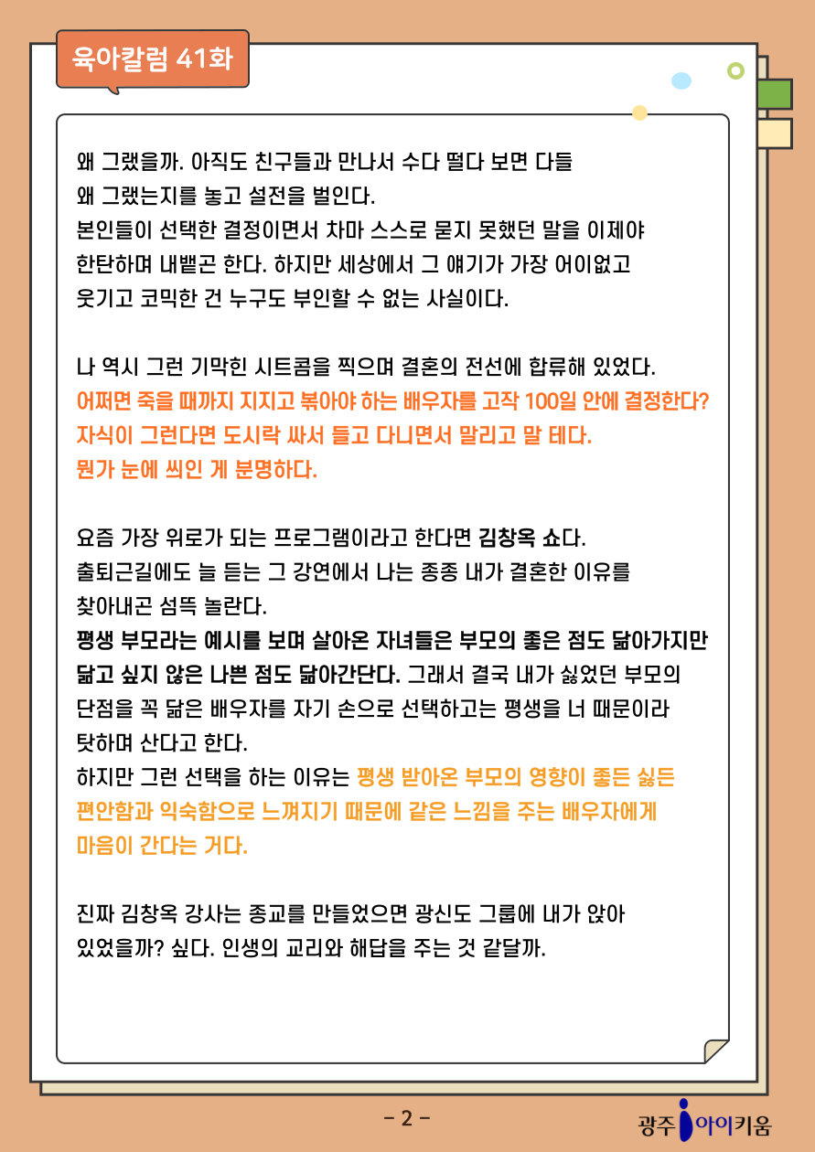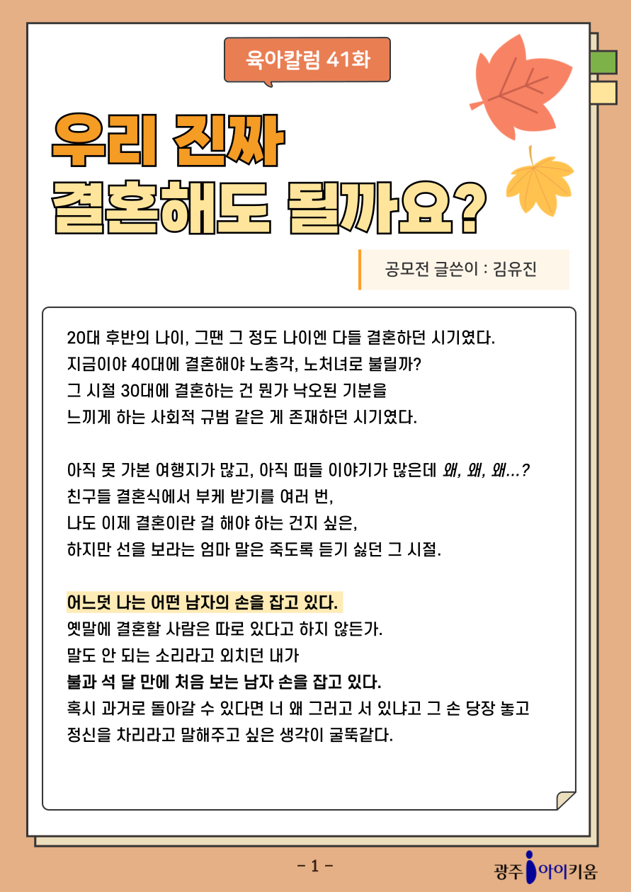 [육아칼럼] 41화 - 우리 진짜 결혼해도 될까요? 등록일 : 2025-11-20 13:19 카테고리 : 카테고리 없음 작성자 : 운영자 조회수 : 73 첨부파일 2025_칼럼표지 11월_복사본-002.png 다운로드 목록