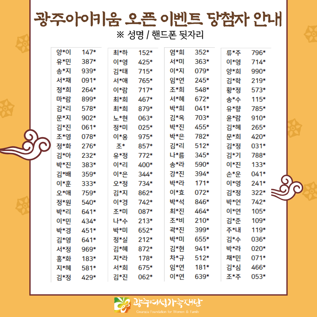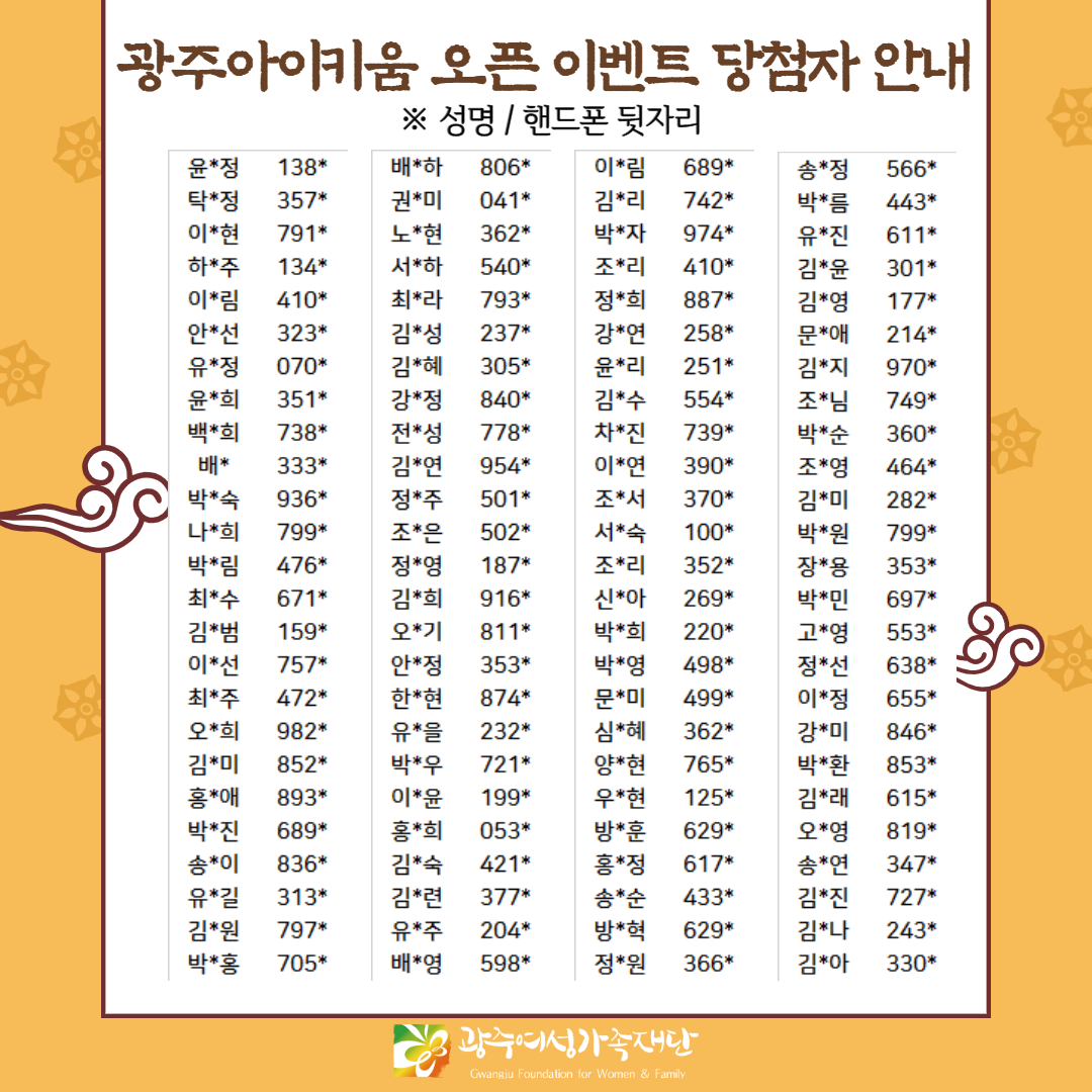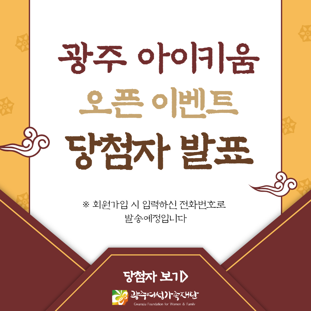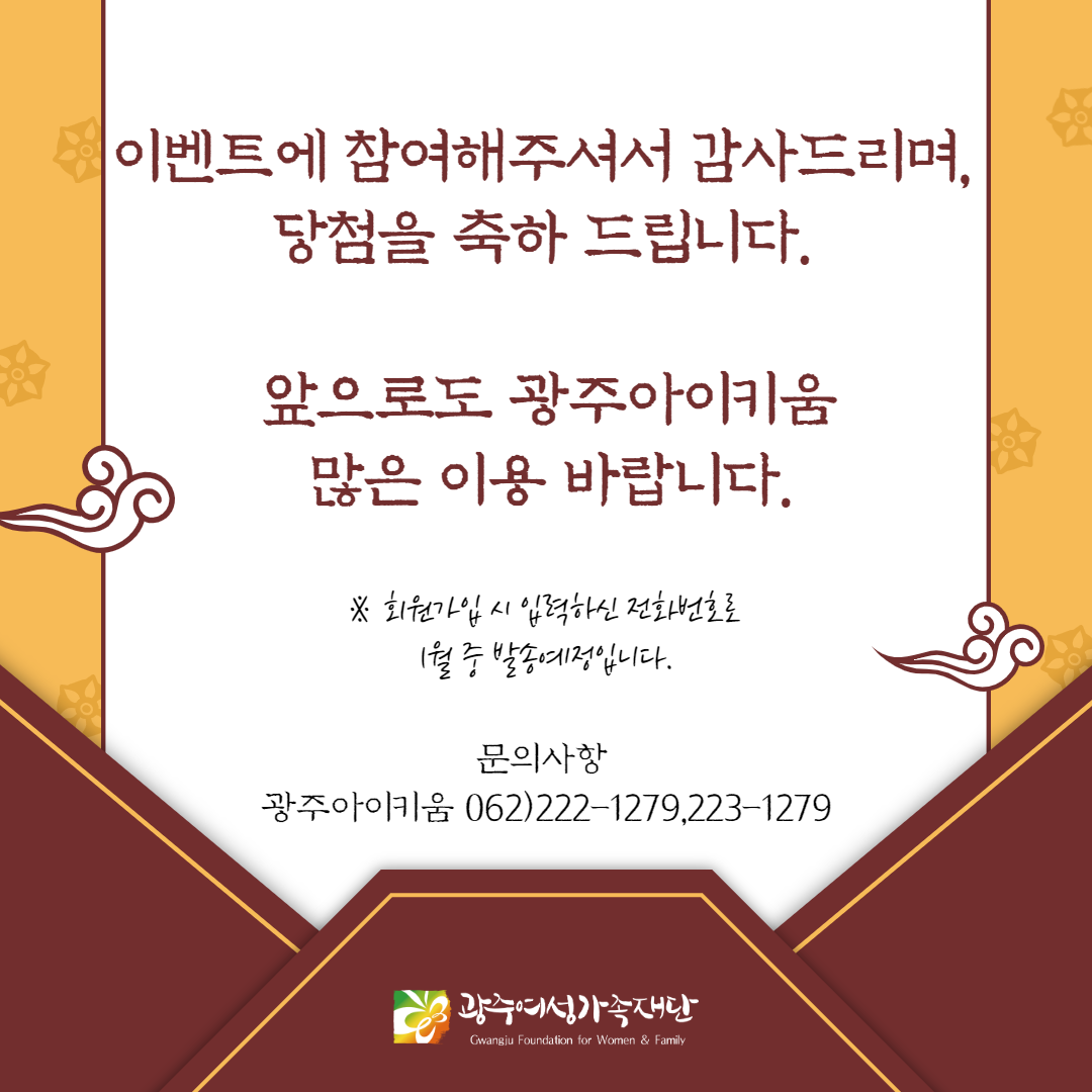 광주 아이키움 오픈이벤트 당첨자 발표 등록일 : 2021-01-11 15:53 작성자 : 운영자 조회수 : 1335 광주 아이키움 오픈 이벤트 당첨자를 발표합니다.^^참여해주신 모든 분들께 감사드리며,앞으로도 많은 이용 부탁드립니다. 목록