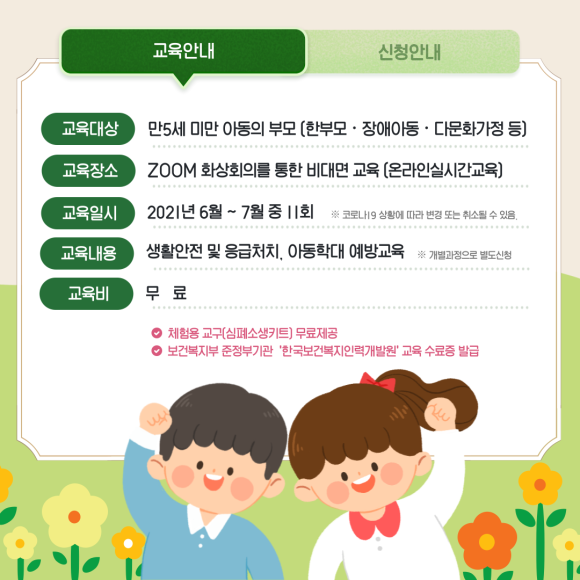 2021년 보호자(부모)대상 아동안전교육 교육안내 등록일 : 2021-06-02 09:36 작성자 : 운영자 조회수 : 1104 첨부파일 붙임 1. 2021년 보호자(부모)대상 아동안전교육 교육안내(한글화).hwp 다운로드 첨부파일 붙임 1. 2021년 보호자(부모)대상 아동안전교육 안내문 (PDF ver.).pdf 다운로드 목록