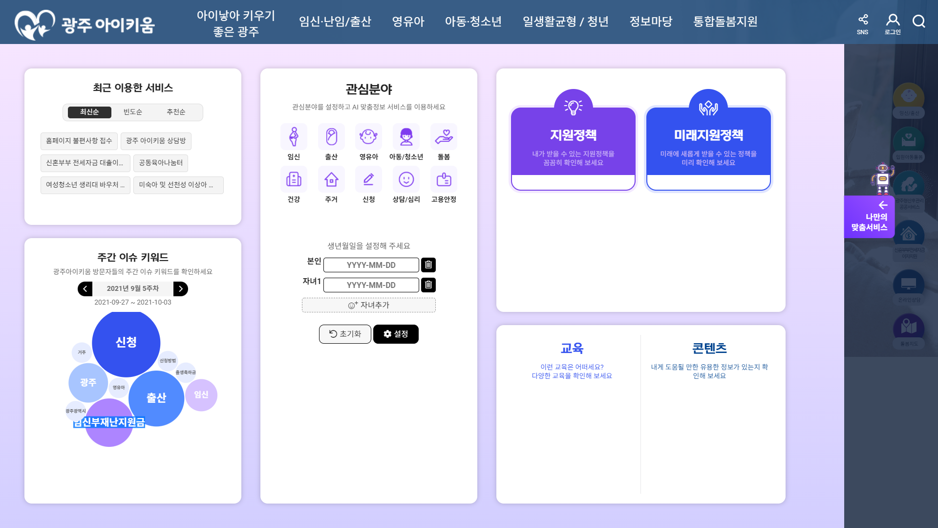 관심 키워드를 설정하고 생년월일을 입력하면 AI 추천 정책과 나에게 필요한 교육 및 콘텐츠를 추천 받을 수 있습니다. 그리고 광주아이키움 홈페이지에서 한 주간 가장 많이 언급된 검색어와 키워드를 한눈에 확인하실 수 있습니다.