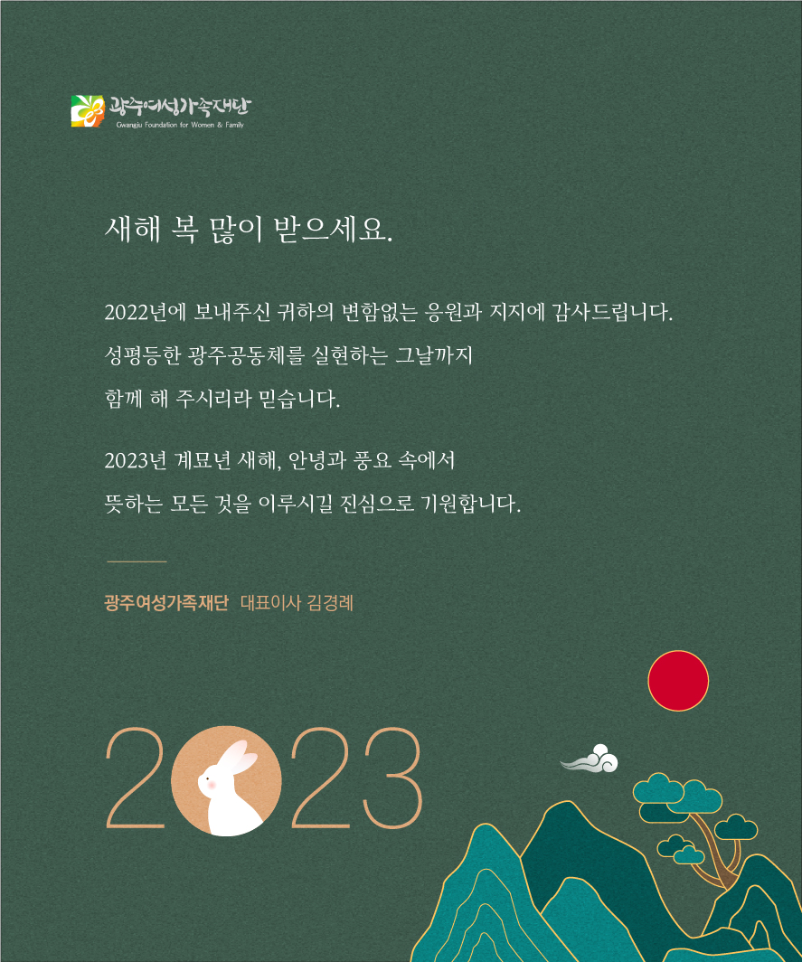 광주아이키움 2023년 신년사 등록일 : 2022-12-30 15:42 작성자 : 운영자 조회수 : 784 새해 복 많으세요.2022년에 보내주신 귀하의 변함없는 응원과 지지에 감사드립니다.성평등한 광주공동체를 실현하는 그날까지 함께 해 주시리라 믿습니다.2023년 계묘년 새해, 안녕과 풍요 속에서 뜻하는 모든 것을 이루시길 진심으로 기원합니다.광주여성가족재단 대표이사 김경례 목록