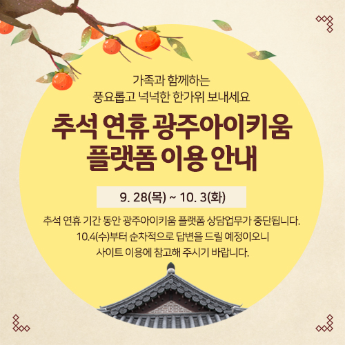 추석 연휴 기간동안 광주아이키움플랫폼 상담 업무가 중단됩니다.