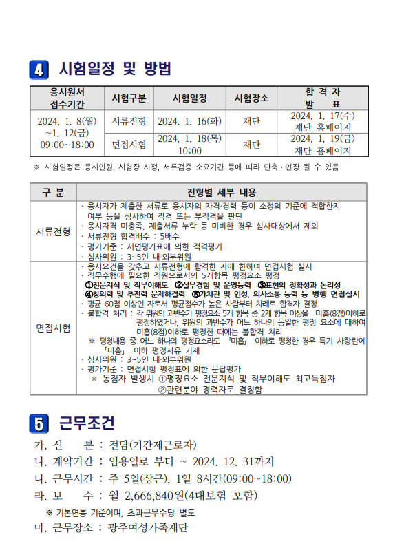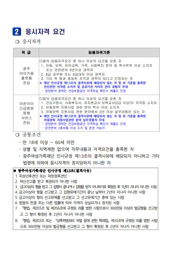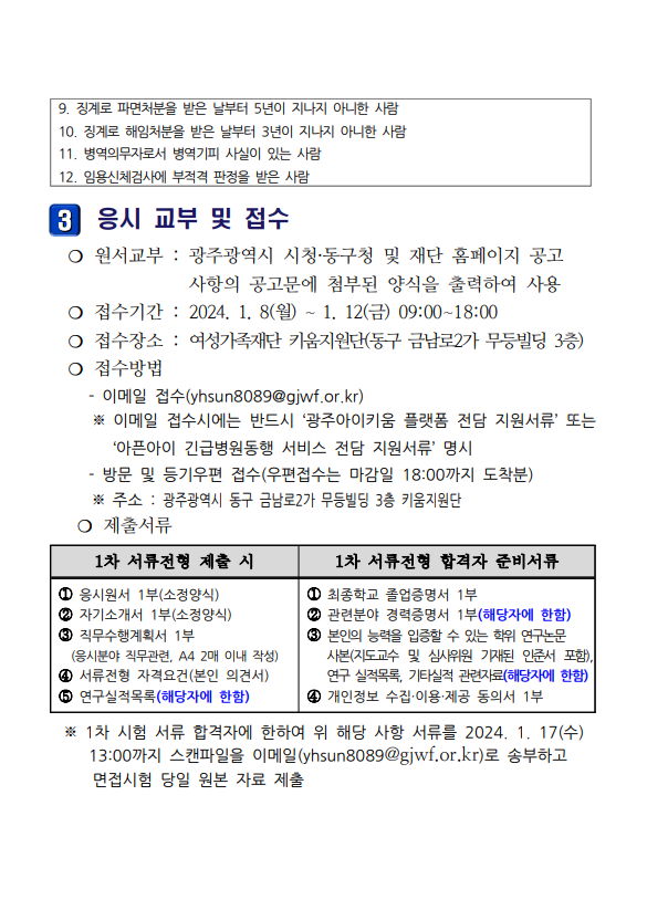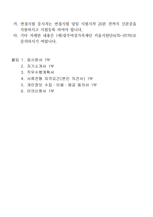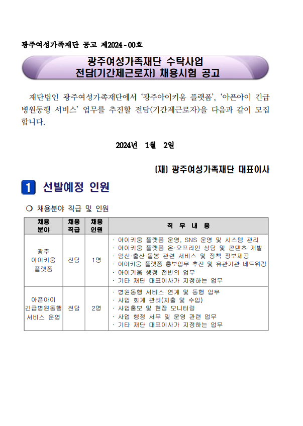 광주여성가족재단 수탁사업 전담[기간제근로자] 채용시험 공고 등록일 : 2024-01-02 15:39 작성자 : 운영자 조회수 : 632 첨부파일 응시원서 및 제출서.hwpx 다운로드 목록