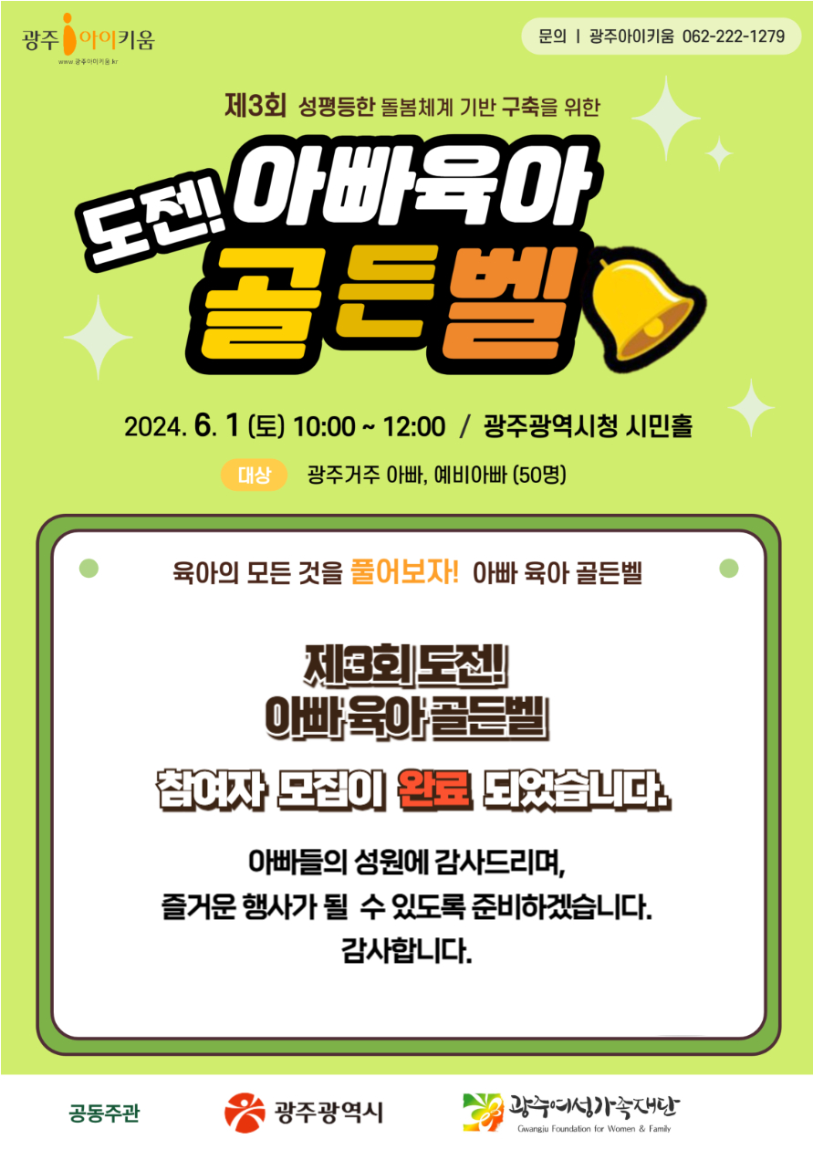 성평등한 돌봄체계 기반 구축을 위한 '제3회 도전! 아빠육아골든벨'이 6월 1일 광주 시청에서 개최됩니다.