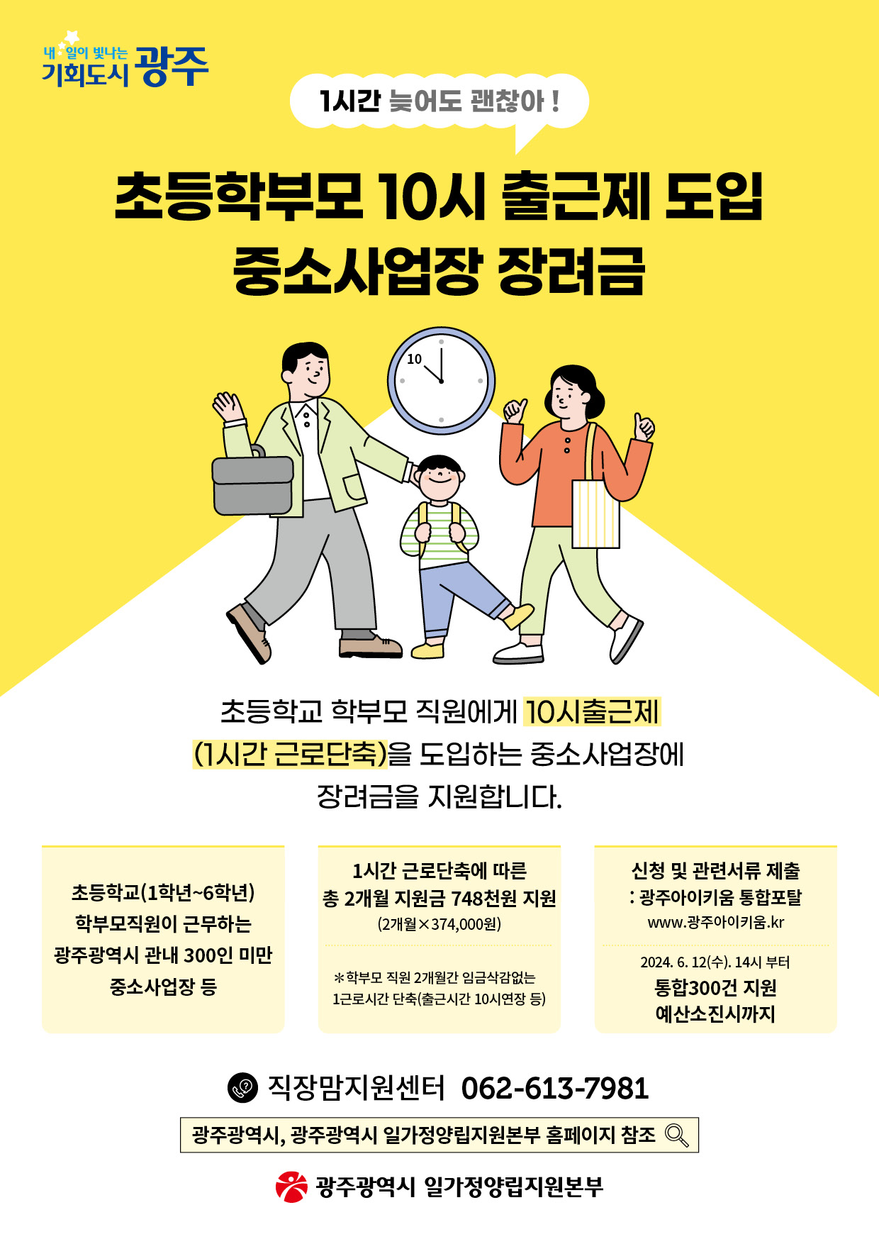 광주광역시 일가정양립지원본부는 초등입학기 10시 출근제 중소사업장 장려금 지원사업 확대에 따른 초등 전학년 대상