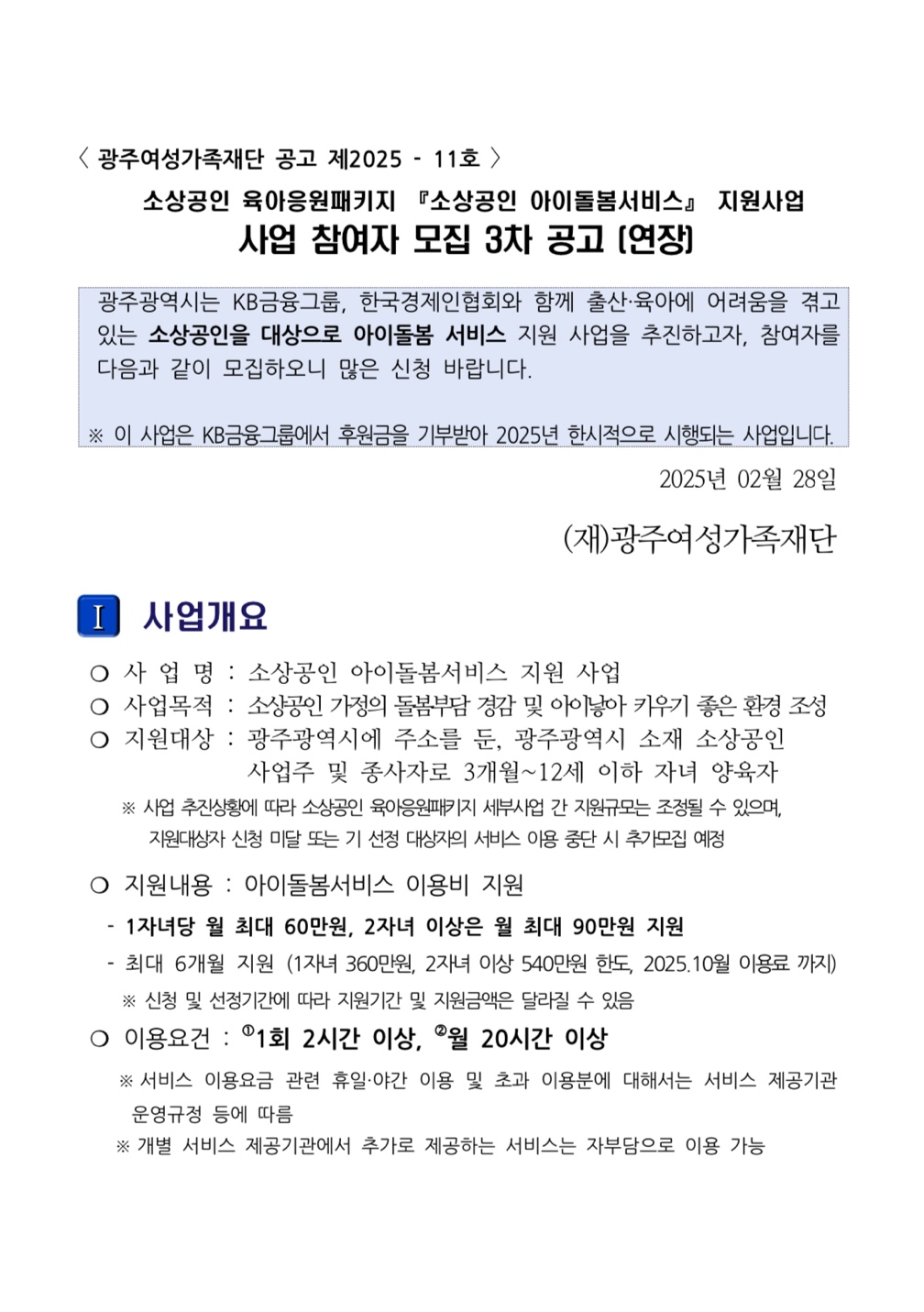 [접수중]'소상공인 육아응원패키지' 3차 공고(연장) 안내 등록일 : 2025-02-28 17:01 작성자 : 운영자 조회수 : 285 첨부파일 소상공인 육아응원패키지 『소상공인 아이돌봄서비스』 지원사업 3차 공고문.hwp 다운로드 첨부파일 소상공인 육아응원패키지 『1인 여성 자영업자 임신·출산』지원 사업 3차 공고문.hwp 다운로드 첨부파일 20251105_2.jpg 다운로드 [소상공인 육아응원패키지] 3차 공고(연장) 1. 소상공인 아이돌봄서비스 지원사업 2. 1인 여성 자영업자 임신‧출산 대체인력비 지원사업 소상공인 육아응원패키지 지원사업 자세한 내용을 첨부를 확인하시기 바랍니다. 목록