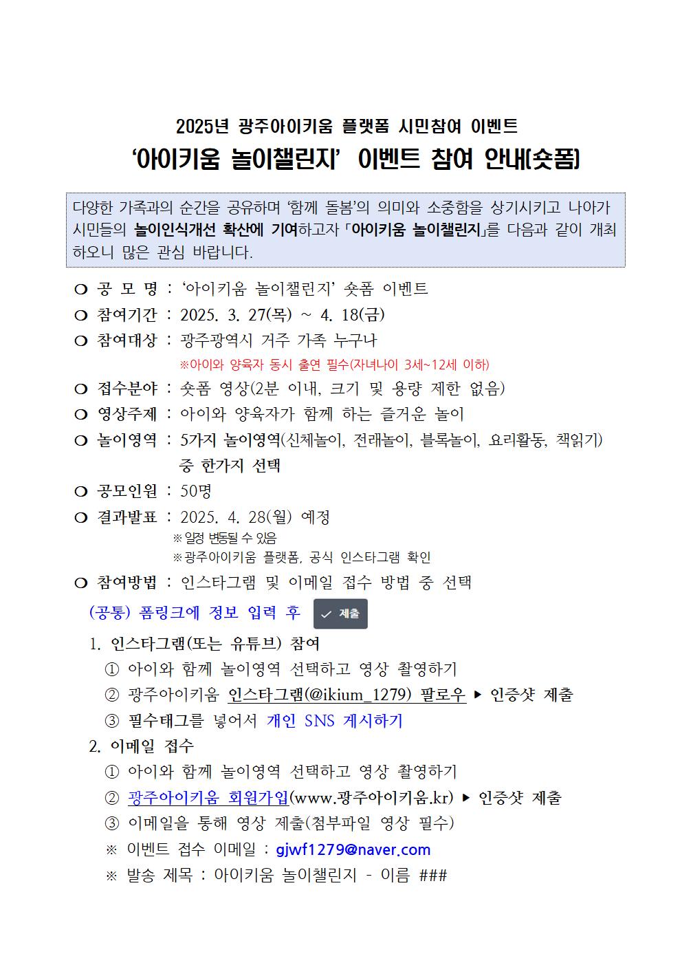 [마감]📢'아이키움 놀이챌린지’ 안내 등록일 : 2025-03-27 11:14 작성자 : 운영자 조회수 : 798 아이와 신나게 놀고, 그 순간을 영상으로 남겨 SNS에 업로드하면 경품이 팡팡!🎁 📢 놀이가 밥이다! 광주아이키움 #놀이챌린지 참여 EVENT🎁⬇ 참여 링크 ⬇ 이벤트 참가 방법이 기존 개인 SNS 영상 게시 방법과 이메일 신청 방법이 추가되어 2가지 입니다.자세한 내용은 아래 안내문을 확인 바랍니다. 목록