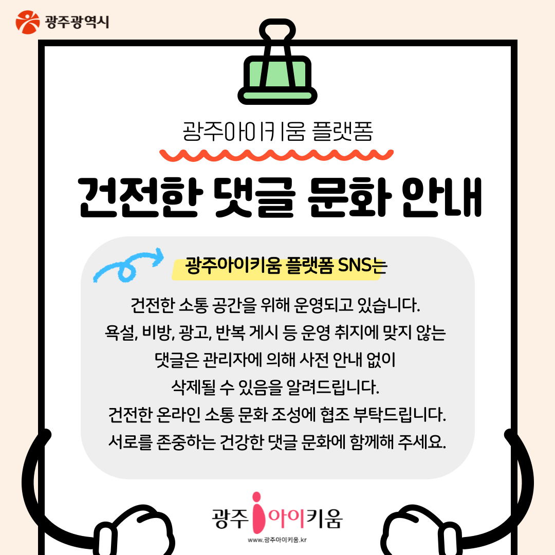 home 맘편한 내★일, 광주아이키움2.0 결혼·임신·출생 영유아 초·중·고 다양한 가족 일생활균형 커뮤니티 아동돌봄지원 소통방 나눔방 광주 아이키움 상담방 돌봄정보방 성폭력 피해 지원 안내 공지사항 건전한 댓글문화 안내 등록일 : 2026-03-12 13:11 작성자 : 운영자 조회수 : 87 광주아이키움 플랫폼 SNS는 건전한 소통 공간을 위해 운영되고 있습니다.욕설, 비방, 광고, 반복 게시 등 운영 취지에 맞지 않는 댓글은 관리자에 의해 사전 안내 없이 삭제될 수 있음을 알려드립니다.건전한 온라인 소통 문화 조성에 협조 부탁드립니다.서로를 존중하는 건강한 댓글 문화에 함께해 주세요. 목록