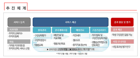 - 서비스 내용 : 아동이 주치의 협약을 맺은 치과의원에 학기*마다 1회 방문하여, 구강검진, 교육 및 예방서비스 제공