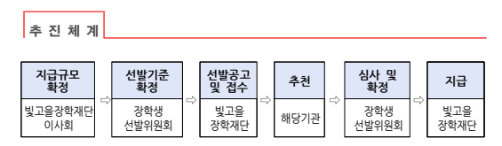 - 공고 및 접수 → 기관 추천 → 장학생선발위원회 심사 → 장학금 지급