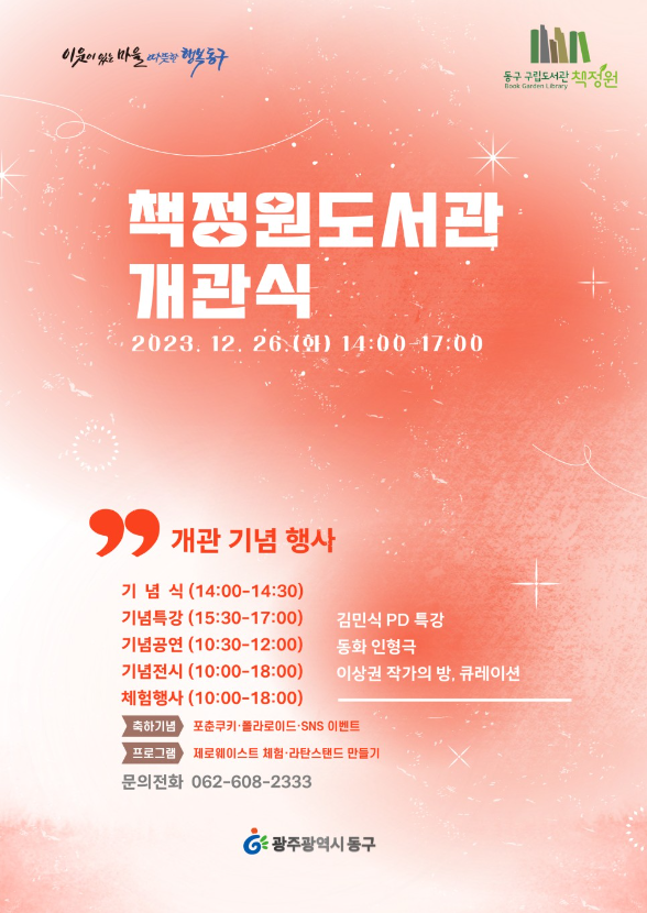 동구 구립 복합 공공도서관 책정원 이 12월 26일(화) 개관함에 따라 주민들과 함께 축하하는 홍보의 장을 마련합니다.